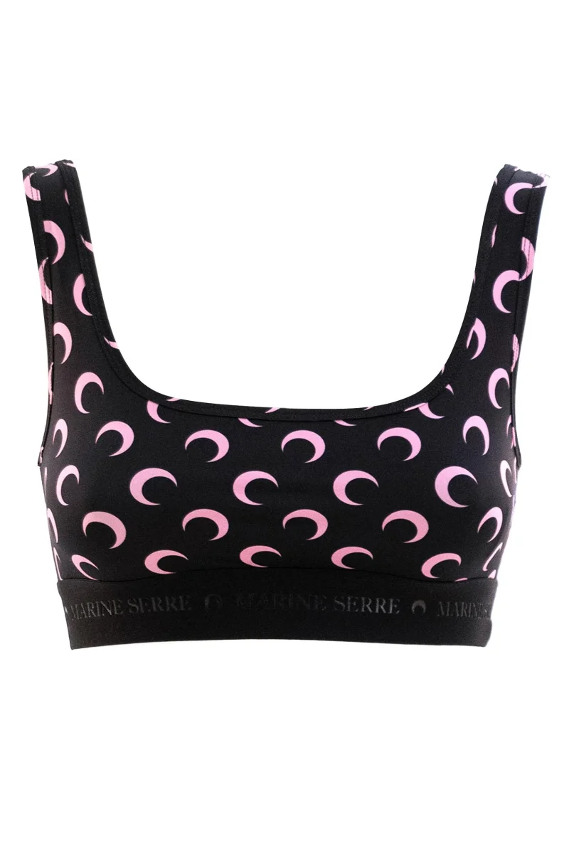 Reggiseno sportivo in jersey elasticizzato di colore nero Composizone: 88% poliammide riciclata 12% spandex riciclato. MADE IN PORTUGAL.
