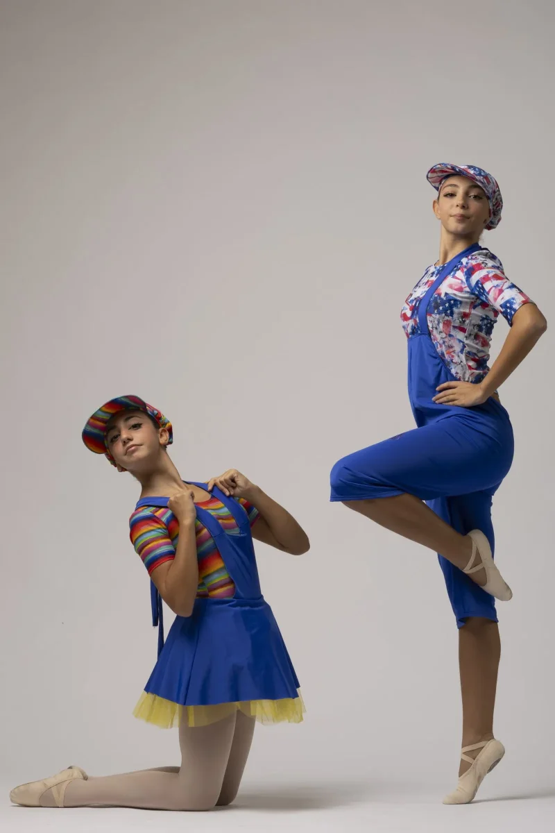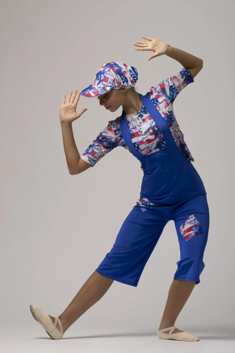 Salopette di Lycra con toppe, maglietta e cappellino in Lycra fantasia