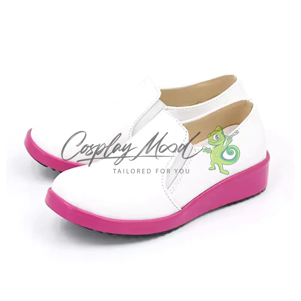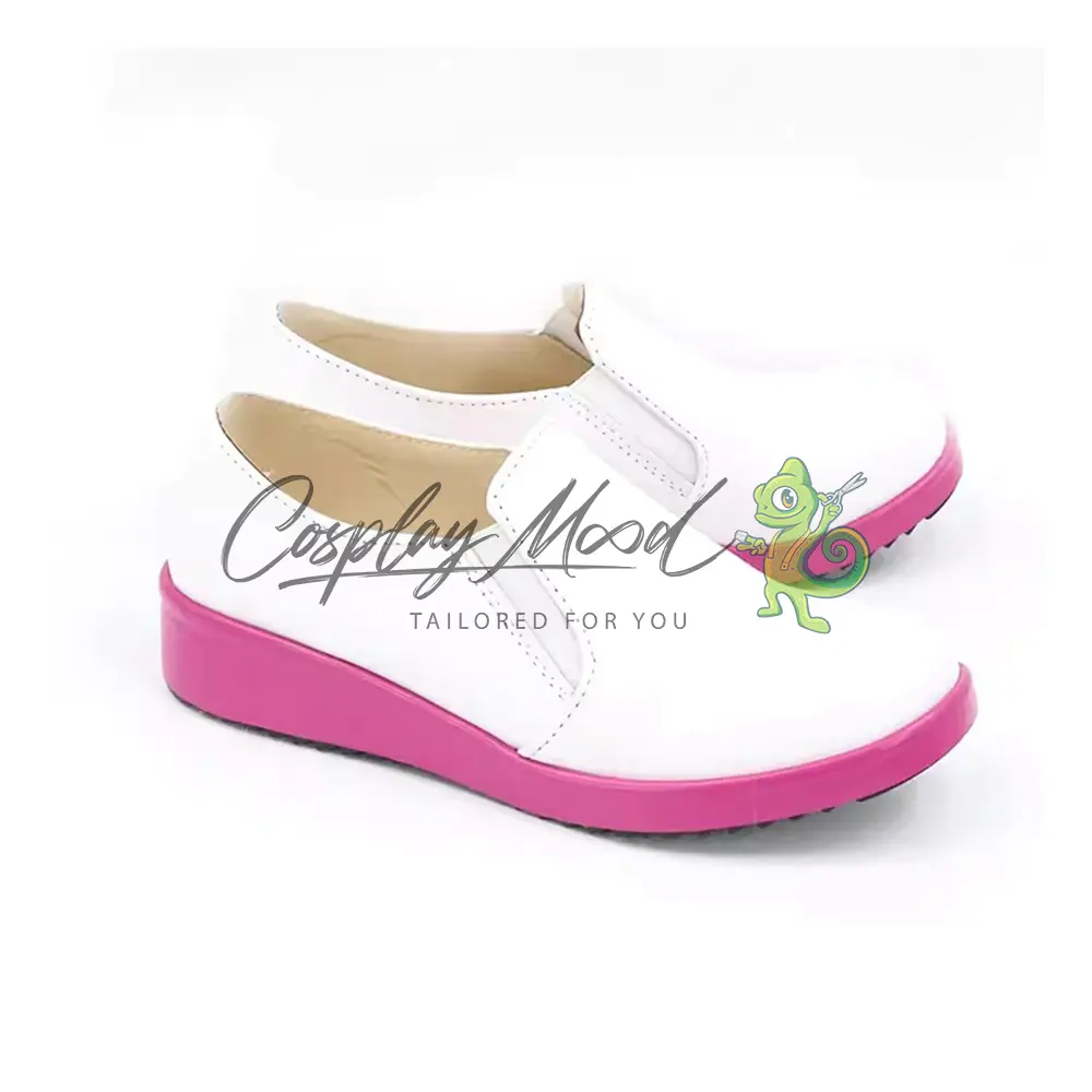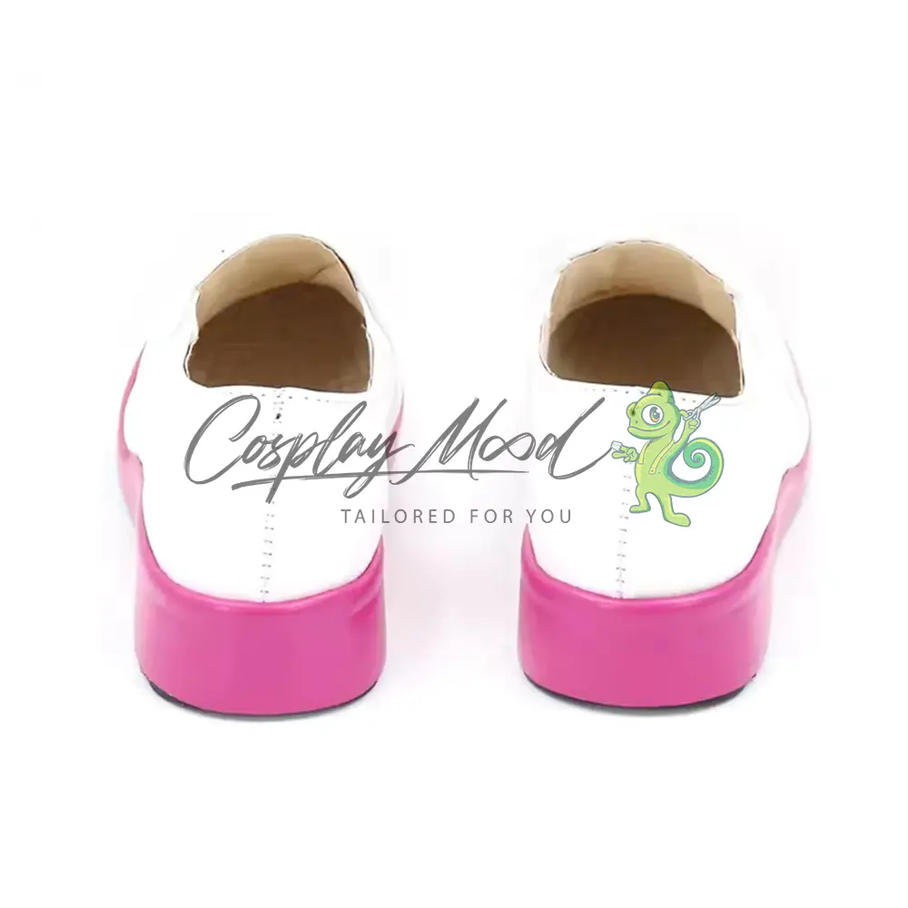 Queste scarpe cosplay sono realizzate in pelle PU e lavorate con dettagli tipici del personaggio in questione. Questo tipo di calzature sono resistenti ad urti e strappi ed appariranno come da immagine: un paio di scarpe bianche stile mocassino con suola color rosa.
