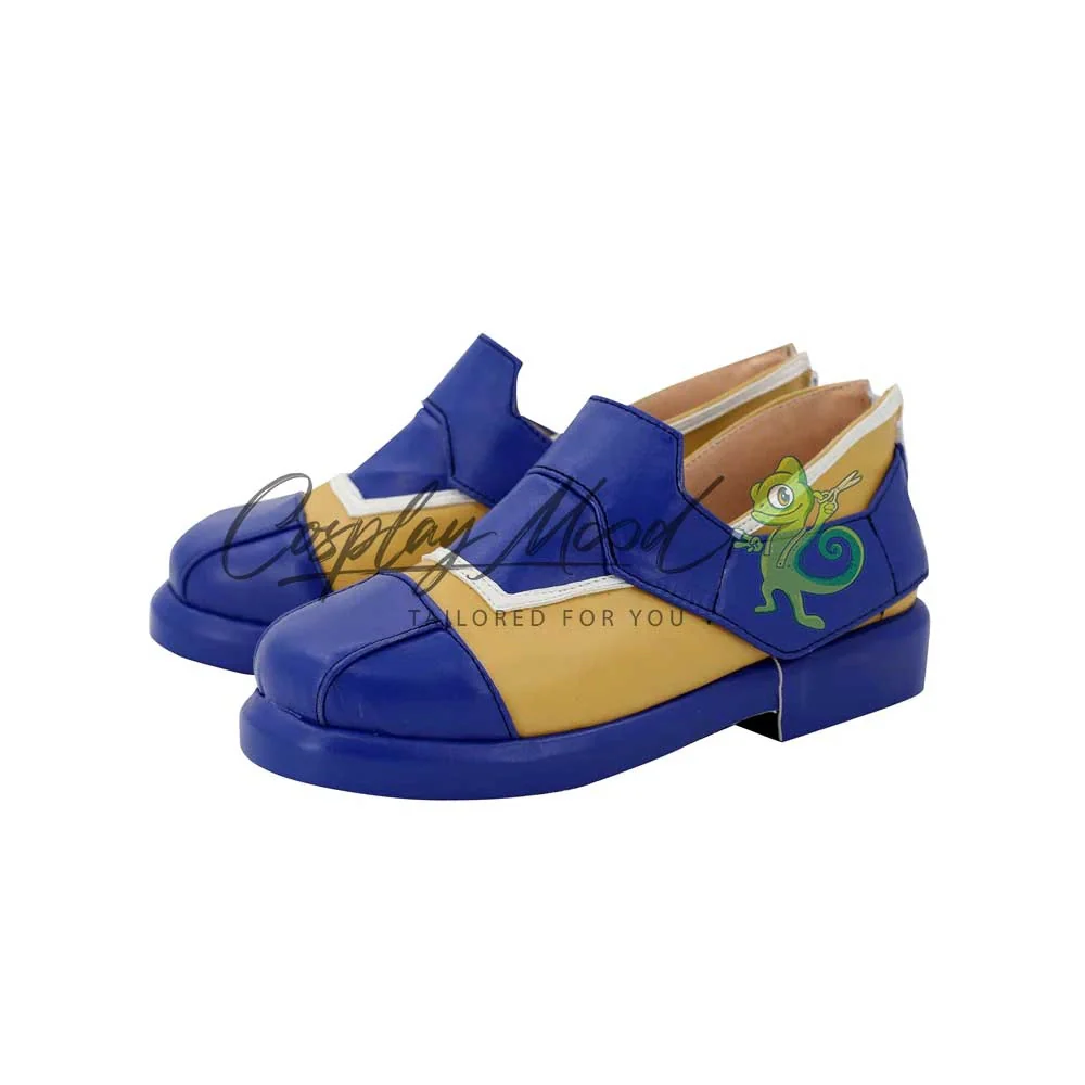 Tutte le nostre calzature sono realizzate in pelle PU e lavorate con dettagli tipici del personaggio in questione. Questo materiale le rende resistenti ad urti e strappi ed appariranno come da immagine: un paio di scarpe prevalentemente di colore blu, dalla suola, al tacco, passando per la punta ed il fronte, con finiture color ocra e decorazioni bianche che corrono dal davanti al dietro della scarpa.