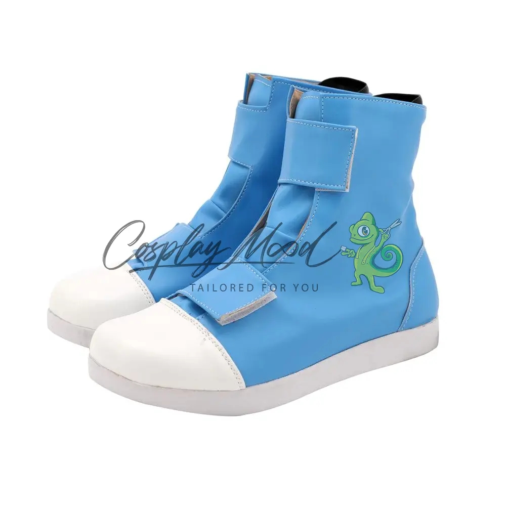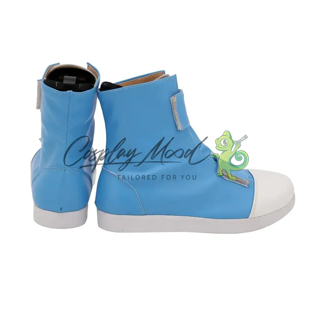 Queste scarpe cosplay sono realizzate in pelle PU e lavorate con dettagli tipici del personaggio in questione. Questo tipo di calzature sono resistenti ad urti e strappi ed appariranno come da immagine: un paio di scarpe azzurre con doppia chiusura a strappo, corredate da punta e suola bianca.