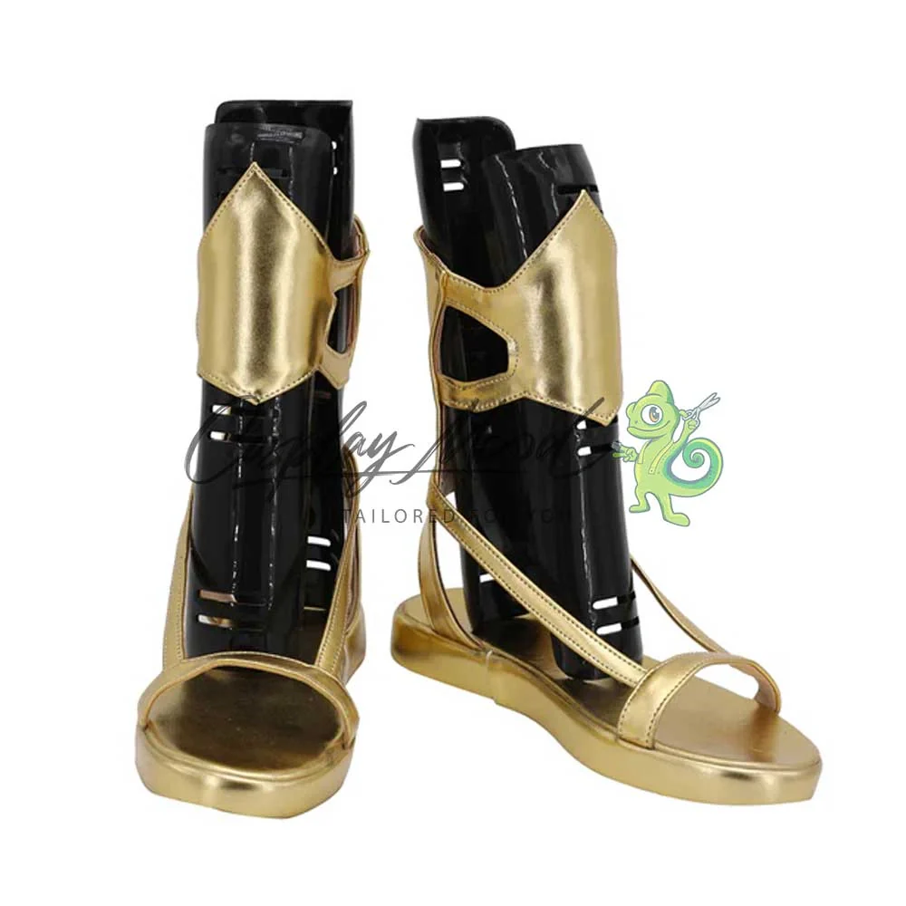 Le scarpe sono realizzate in pelle PU e lavorate con dettagli tipici del personaggio in questione. Questo tipo di calzature sono resistenti ad urti e strappi ed appariranno come da immagine: un paio di sandali dorati stile antica Grecia. La parte superiore riporta una placca dorata, mentre in basso il tallone risulta maggiormente rinforzato. Le nostre calzature cosplay sono realizzate su ordinazione, quando il laboratorio finisce di produrle verranno spedite immediatamente, ricordatevi comunque di pianificare la vostra spedizione in modo tale da poterle ricevere in tempo per la fiera a cui vorrete partecipare. Potrebbe accadere che alcuni tipi di scarpe o stivali all’inizio possano avere un forte odore che per alcune persone potrebbe risultare alquanto sgradevole. Questa cosa si risolverà facilmente mettendo le calzature in un luogo areato per una notte o al massimo per qualche giorno.