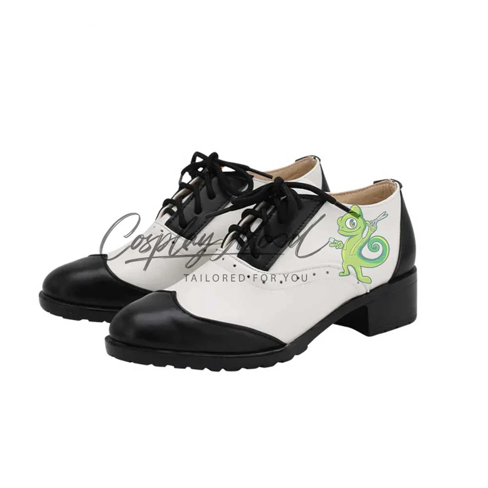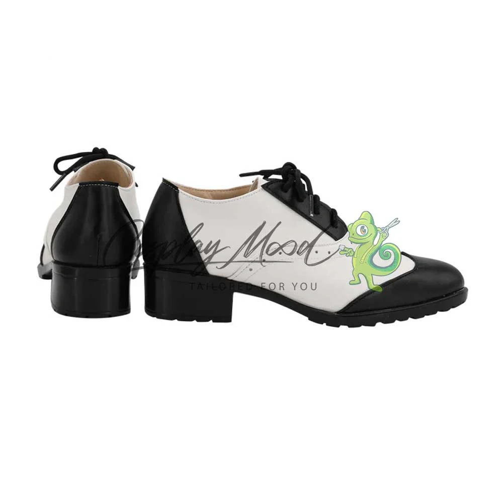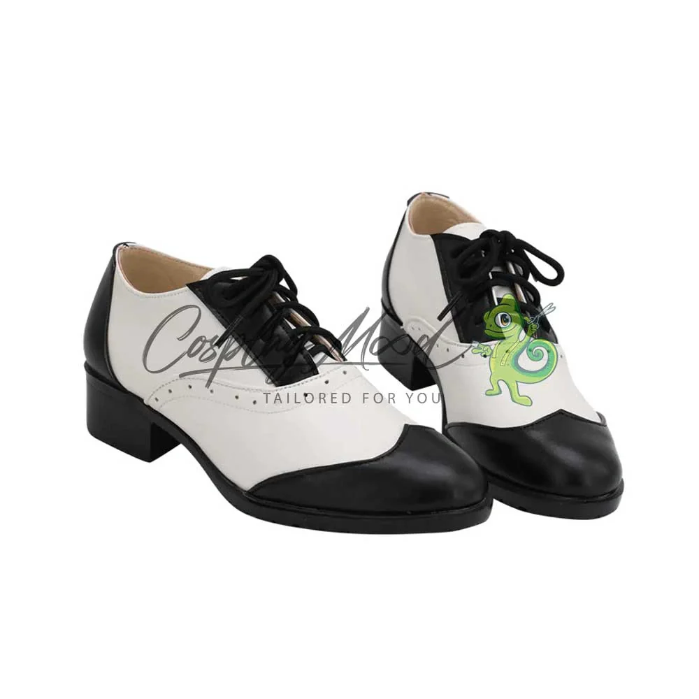 Le scarpe sono realizzate in pelle PU e lavorate con dettagli tipici del personaggio in questione. Questo tipo di calzature sono resistenti ad urti e strappi ed appariranno come da immagine: un paio di scarpe eleganti stile tip tap di colore prevalentemente bianco con punta, tacco, tallone e suola di colore nero. Sul fronte si trova una placca sempre nera corredata da stringhe del medesimo colore. Le scarpe cosplay sono realizzate su ordinazione, quando il laboratorio finisce di produrle verranno spedite immediatamente al destinatario. All’inizio, potrebbe accadere che alcuni tipi di scarpe o stivali possano emanare un forte odore che per alcune persone potrebbe risultare sgradevole. L’inconveniente si risolverà facilmente mettendo le scarpe o gli stivali in un luogo areato per una sera o al massimo qualche giorno.