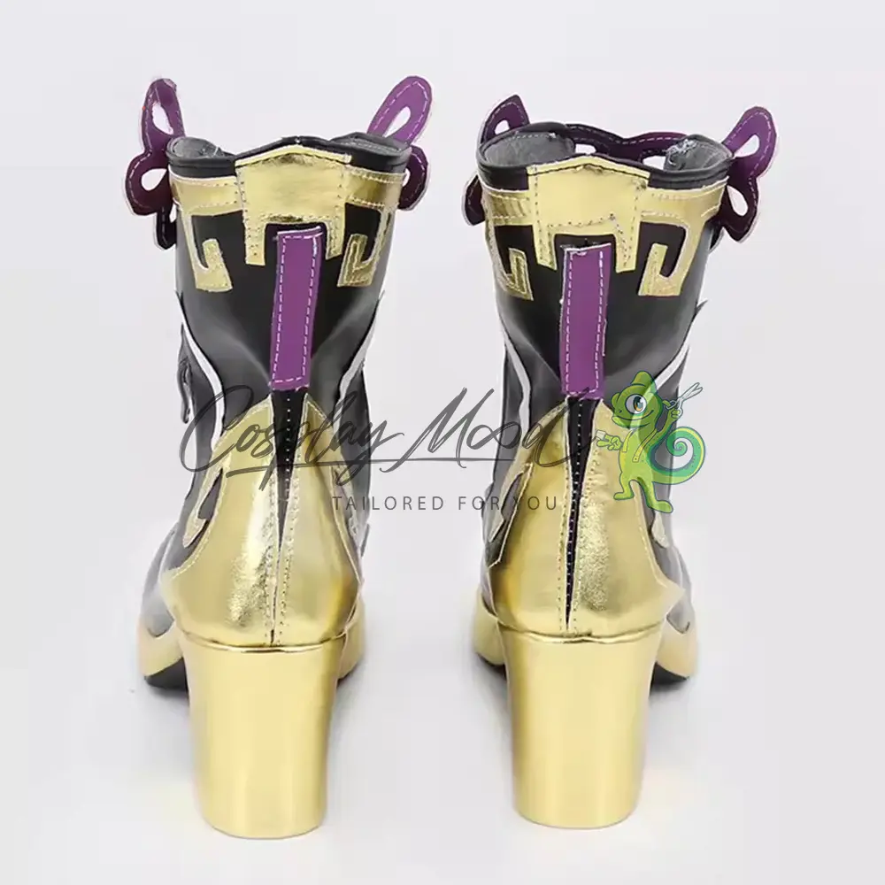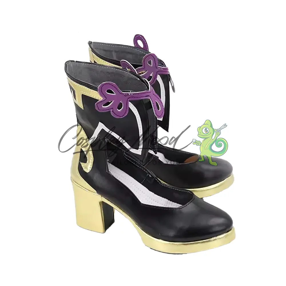 Queste scarpe cosplay sono realizzate in pelle PU e lavorate con dettagli tipici del personaggio in questione. Questo tipo di calzature sono resistenti ad urti e strappi ed appariranno come da immagine: un paio di scarpe nere con tacco e suola bordati di dorato aperte nella zona frontale, decorazione color oro sul tallone, ai lati e nella parte alta della scarpa, finitura frontale geometrica di color viola, come la riga che si trova sul retro delle scarpe.