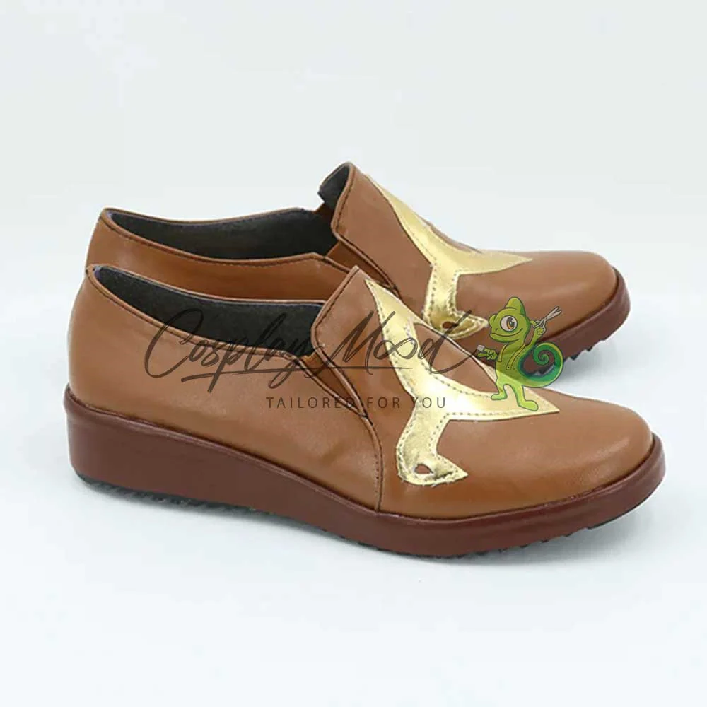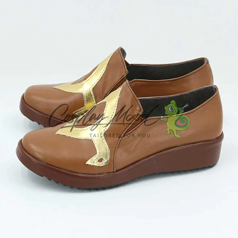 Le scarpe sono realizzate in pelle PU e lavorate con dettagli tipici del personaggio in questione. Questo tipo di calzature sono resistenti ad urti e strappi ed appariranno come da immagine: un paio di mocassini marroni con decorazioni dorate. Le scarpe cosplay sono fatte su ordinazione, quando il laboratorio finisce di realizzarle verranno spedite immediatamente. Potrebbe accadere che alcuni tipi di scarpe o stivali all’inizio possano avere un forte odore che per alcune persone potrebbe risultare sgradevole. Questa cosa si risolverà facilmente mettendo le scarpe o gli stivali in un luogo areato per qualche giorno.