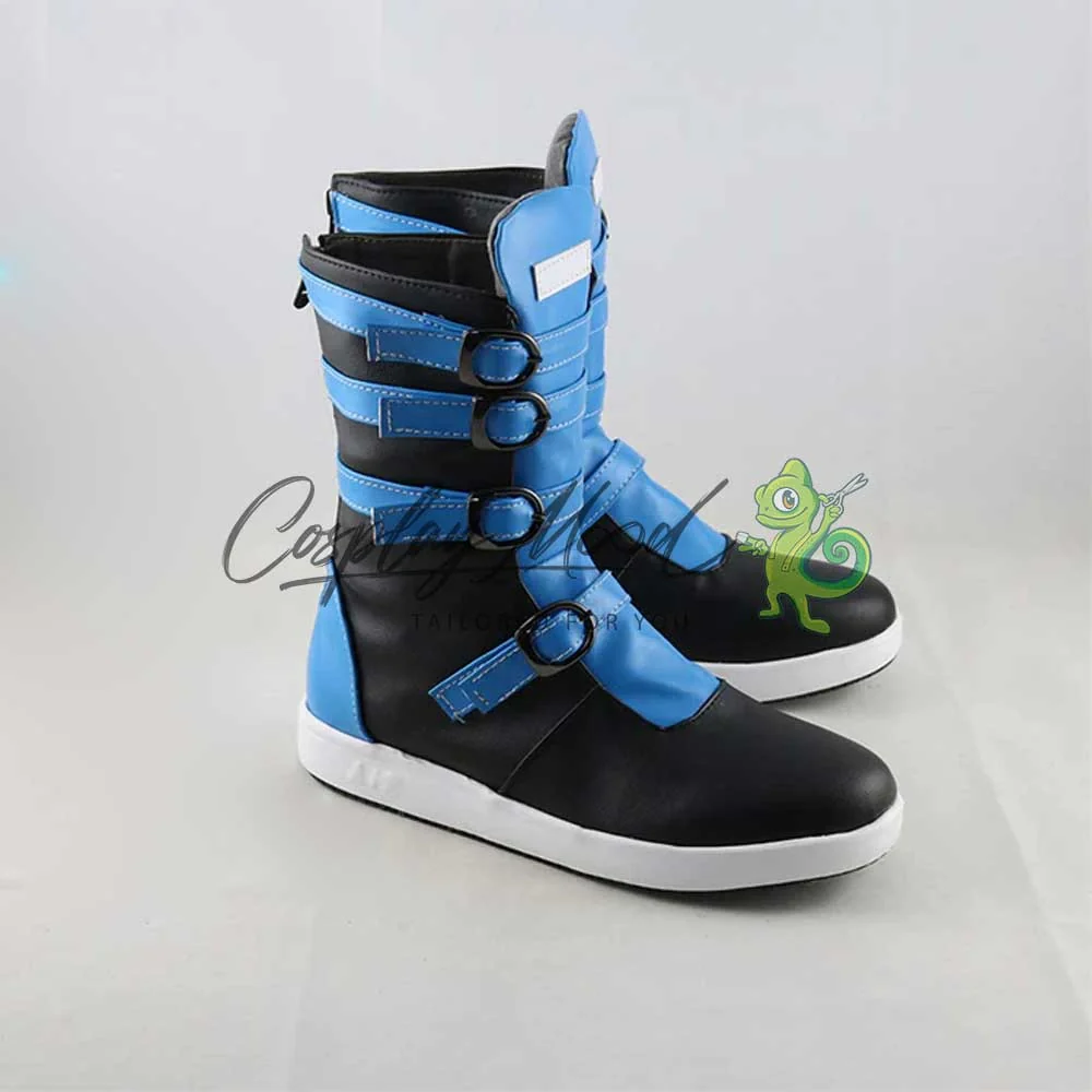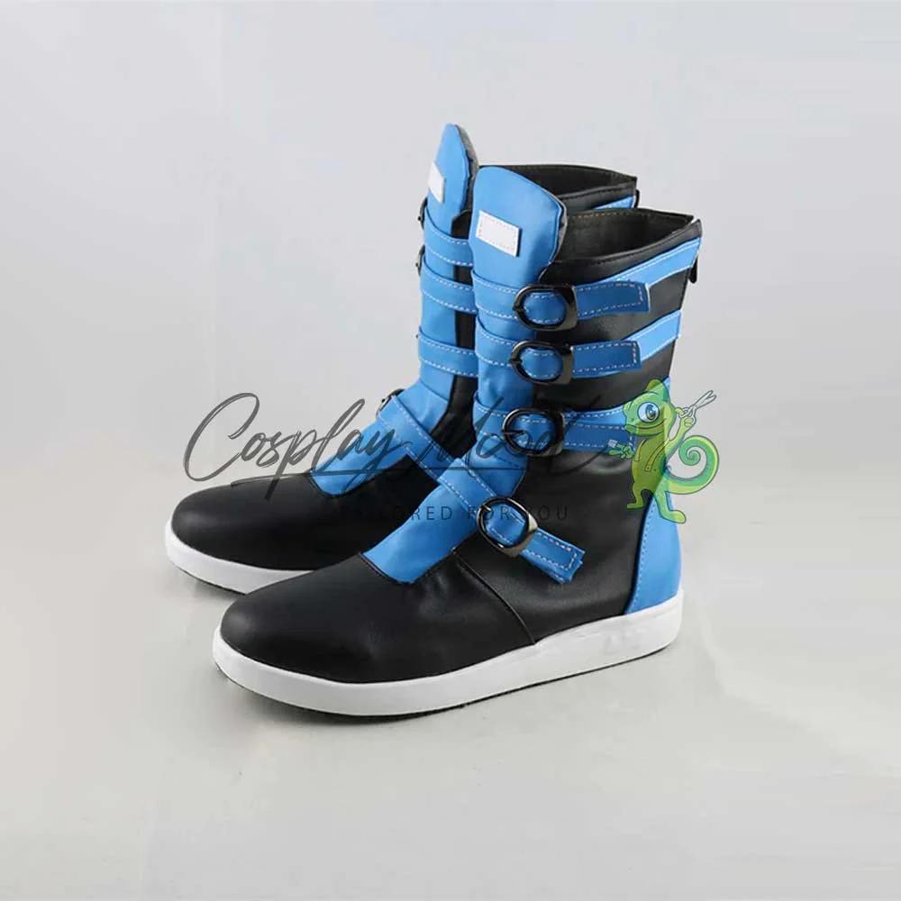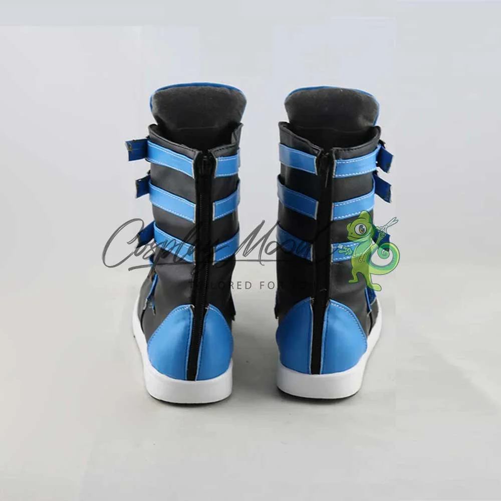 Le scarpe sono realizzate in pelle PU e lavorate con dettagli tipici del personaggio in questione. Questo tipo di calzature cosplay sono resistenti ad urti e strappi ed appariranno come da immagine: un paio di scarpe nere con la suola bianca e con una parte centrale di color azzurro, legata in vari punti da cinghie dello stesso colore, tutte corredate da fibbie. In alto, sempre sulla linguetta centrale si trova una placchetta bianca e sul retro una zona rinforzata di color azzurro a protezione del tallone. Le scarpe cosplay sono realizzate su ordinazione, quando il laboratorio finisce di produrle verranno spedite immediatamente al destinatario. All’inizio, potrebbe accadere che alcuni tipi di scarpe o stivali possano emanare un forte odore che per alcune persone potrebbe risultare sgradevole. L’inconveniente si risolverà facilmente mettendo le scarpe o gli stivali in un luogo areato per una sera o al massimo qualche giorno.