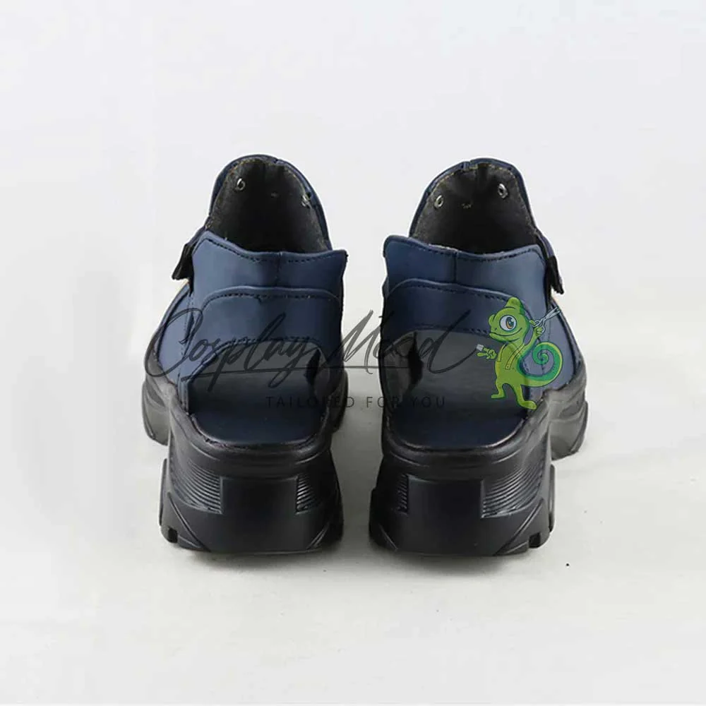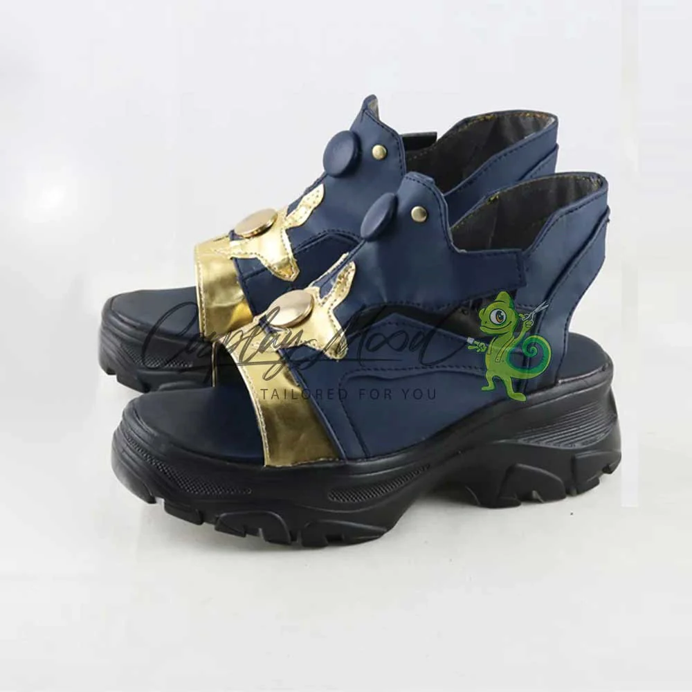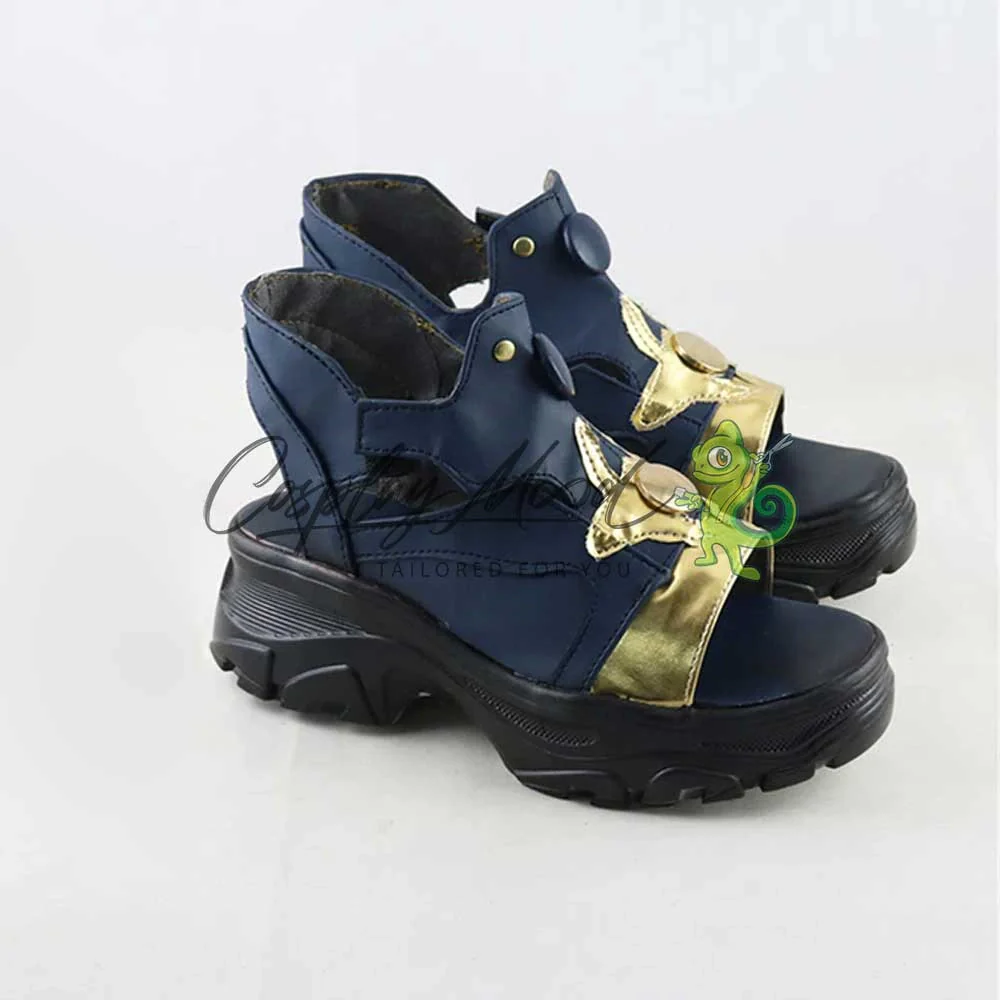 Le scarpe sono realizzate in pelle PU e lavorate con dettagli tipici del personaggio in questione. Questo tipo di calzature sono resistenti ad urti e strappi ed appariranno come da immagine: un paio di scarpe blu notte con suole rialzate e rinforzate di colore nero. Sul fronte è posta una decorazione dorata che borda l’apertura per le dita e la zona subito superiore con l’aggiunta di una piccola placchetta ovale color oro. All’altezza della caviglia è posto un altro cerchietto in rilievo di colore blu notte fiancheggiato da due più piccoli color oro. La calzatura è aperta in vari punti, come il tallone, i lati e la parte frontale, si confà quindi maggiormente ad un look estivo. Le scarpe cosplay sono realizzate su ordinazione, quando il laboratorio finisce di produrle verranno spedite immediatamente al destinatario. All’inizio, potrebbe accadere che alcuni tipi di scarpe o stivali possano emanare un forte odore che per alcune persone potrebbe risultare sgradevole. L’inconveniente si risolverà facilmente mettendo le scarpe o gli stivali in un luogo areato per una sera o al massimo qualche giorno.