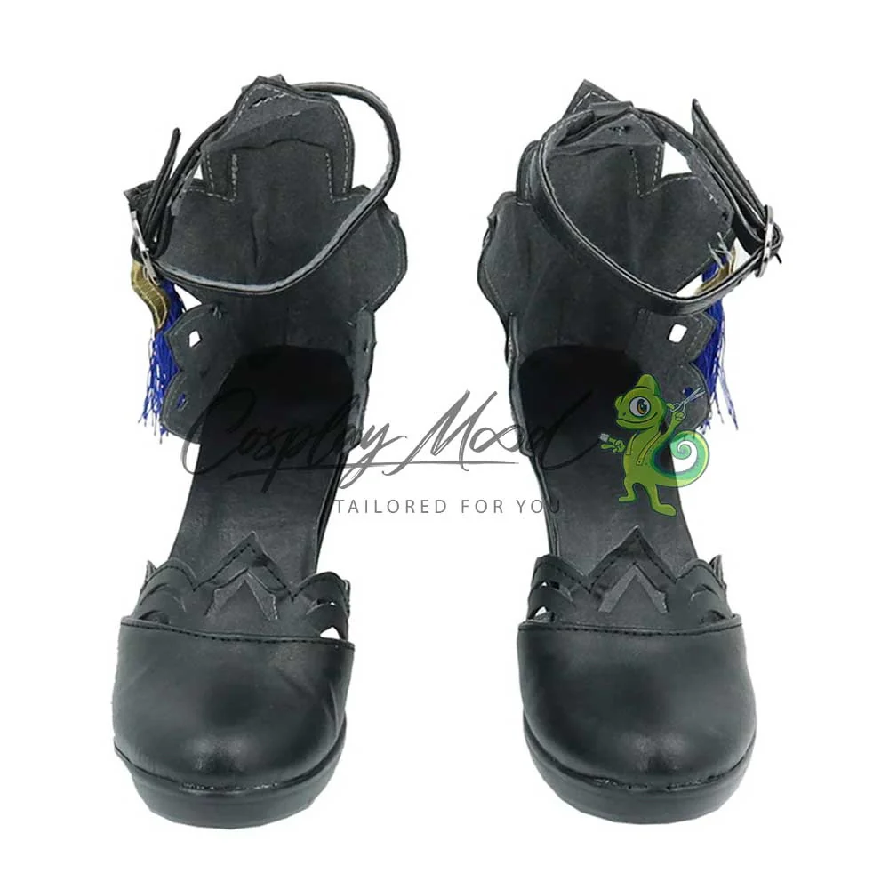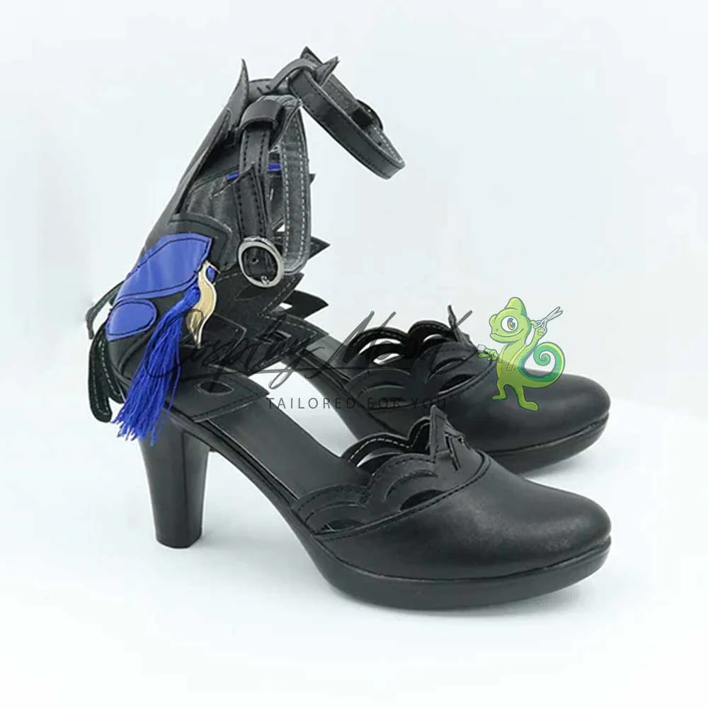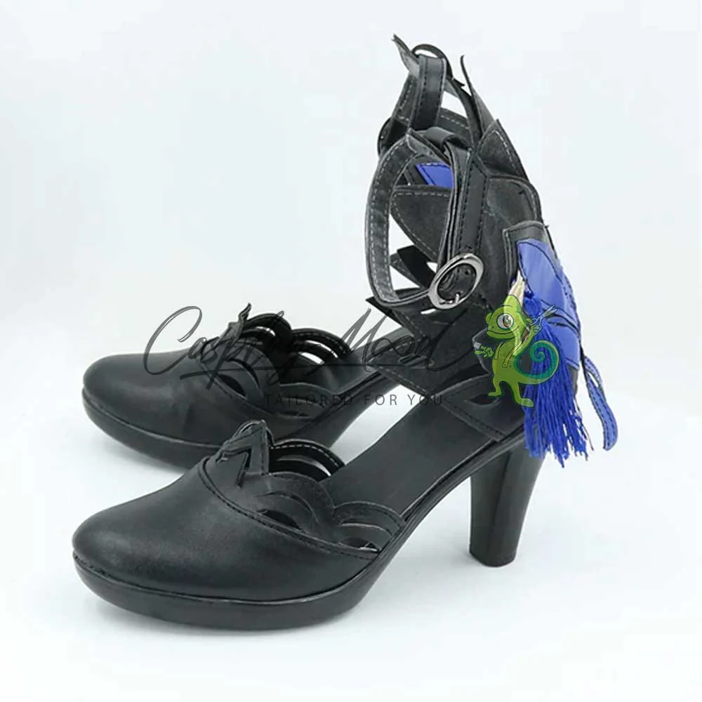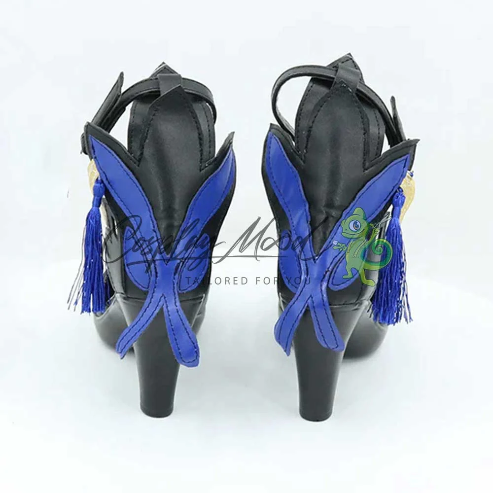 Le scarpe sono realizzate in pelle PU e lavorate con dettagli tipici del personaggio in questione. Questo tipo di calzature sono resistenti ad urti e strappi ed appariranno come da immagine: un paio di eleganti scarpe con il tacco nere lavorate con vari elementi dello stesso colore. Sul retro si trova una vistosa decorazione a forma di farfalla, dei pendagli lunghi blu e decorazioni dorate a fianco. Le scarpe cosplay sono fatte su ordinazione, quando il laboratorio finisce di realizzarle verranno spedite immediatamente. Potrebbe accadere che alcuni tipi di scarpe o stivali all’inizio possano avere un forte odore che per alcune persone potrebbe risultare sgradevole. Questa cosa si risolverà facilmente mettendo le scarpe o gli stivali in un luogo areato per qualche giorno.