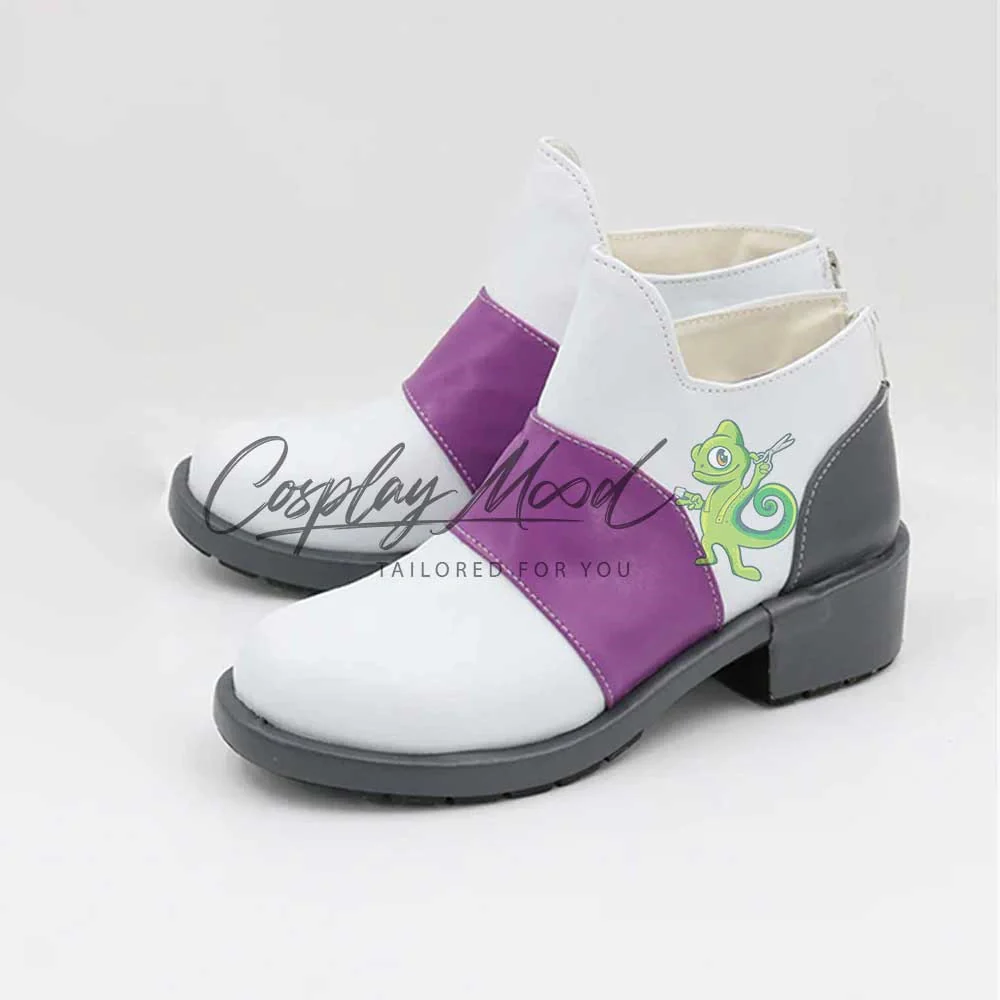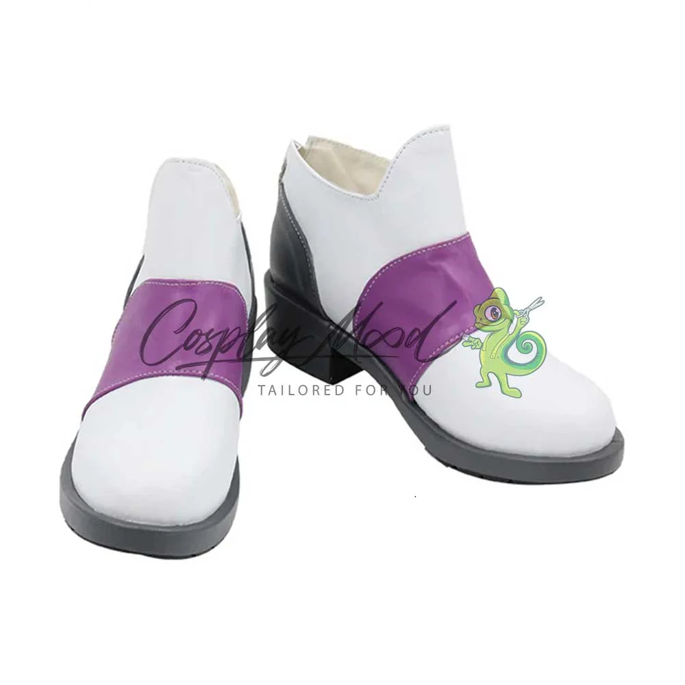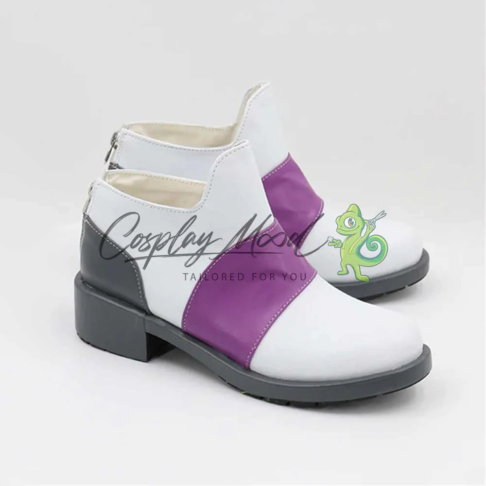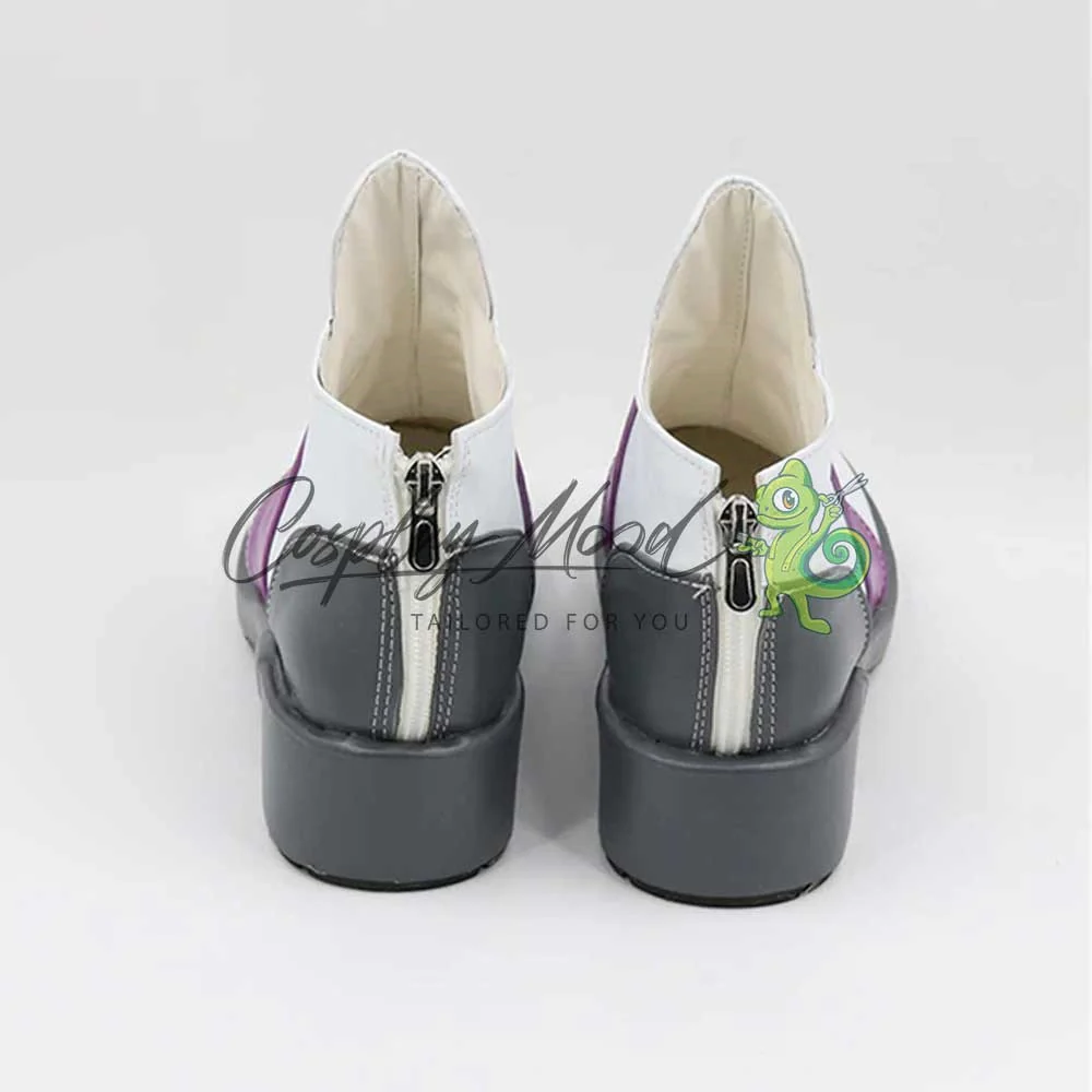 Tutte le nostre calzature sono realizzate in pelle PU e lavorate con dettagli tipici del personaggio in questione. Questo materiale le rende resistenti ad urti e strappi ed appariranno come da immagine: un paio di scarpe bianche con una fascia centrale viola, tallone, suola e tacchetto sono di colore nero. Le nostre calzature cosplay sono fatte su ordinazione, quando il laboratorio finisce di realizzarle verranno spedite immediatamente. Potrebbe accadere che alcuni tipi di scarpe o stivali all’inizio possano emanare un forte odore che per alcune persone potrebbe risultare alquanto sgradevole. Questa cosa si risolverà facilmente mettendo le scarpe o gli stivali in un luogo areato per una notte o al massimo per qualche giorno.