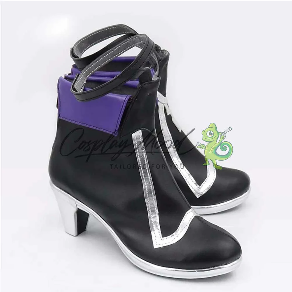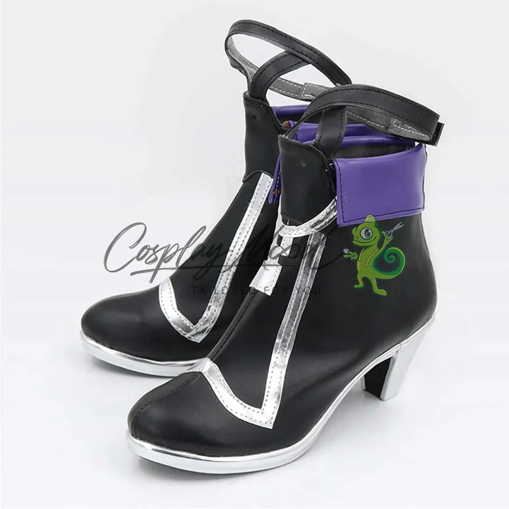 Le scarpe sono realizzate in pelle PU e lavorate con dettagli tipici del personaggio in questione. Questo tipo di calzature sono resistenti ad urti e strappi ed appariranno come da immagine: un paio di scarpe nere con tacco e suola bordati di argento, stesso colore impiegato nelle decorazioni geometriche frontali. La parte alta presenta un laccetto nero richiudibile con il velcro all’altezza della caviglia ed un risvolto color viola ai lati.