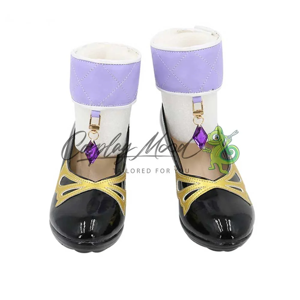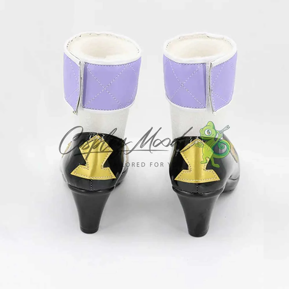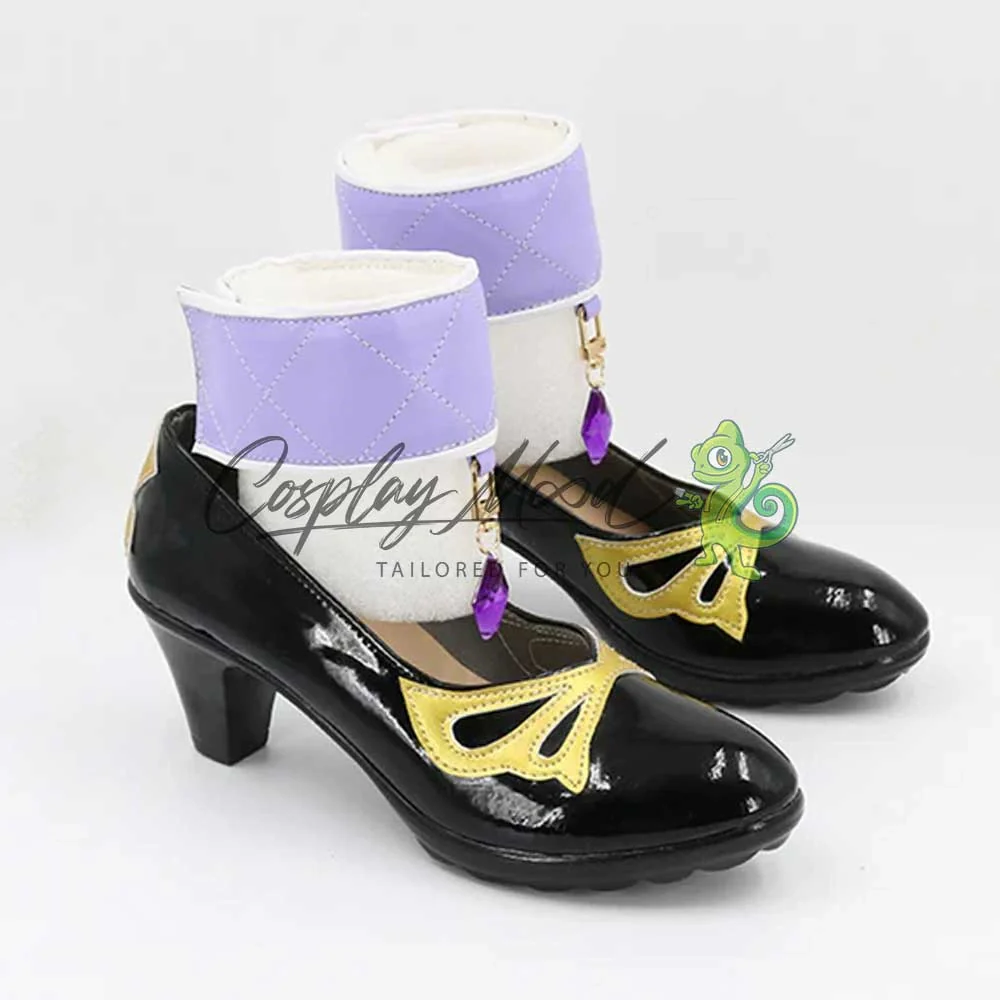 Le scarpe sono realizzate in pelle PU e lavorate con dettagli tipici del personaggio in questione. Questo tipo di calzature sono resistenti ad urti e strappi ed appariranno come da immagine: un paio di scarpe nere con il tacco con una decorazione dorata a forma di farfalla sul fronte e due decorazioni del medesimo colore sul retro. Le calzature sono fornite con due fasce color lilla decorate con pietre viola. Grazie al velcro le due fasce sono modulabili, permettendo in tal modo di adattarsi a diversi tipi di caviglia. Le scarpe cosplay sono fatte su ordinazione, quando il laboratorio finisce di realizzarle verranno spedite immediatamente. Potrebbe accadere che alcuni tipi di scarpe o stivali all’inizio possano avere un forte odore che per alcune persone potrebbe risultare sgradevole. Questa cosa si risolverà facilmente mettendo le scarpe o gli stivali in un luogo areato per qualche giorno.