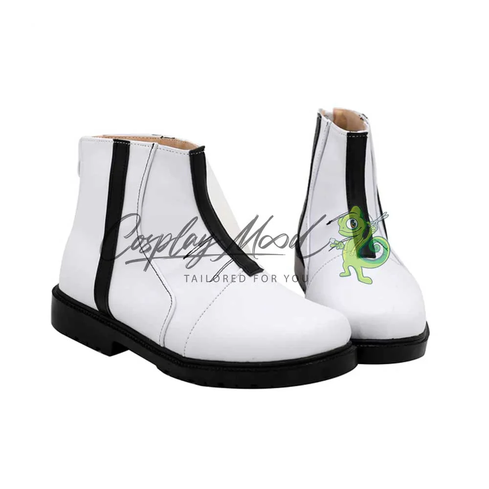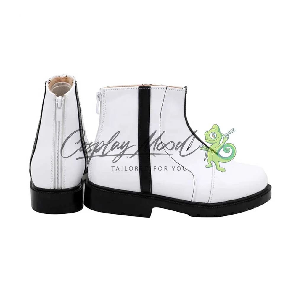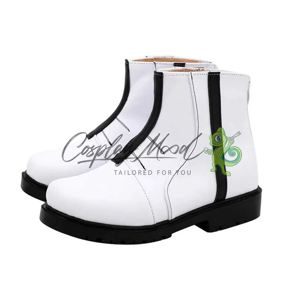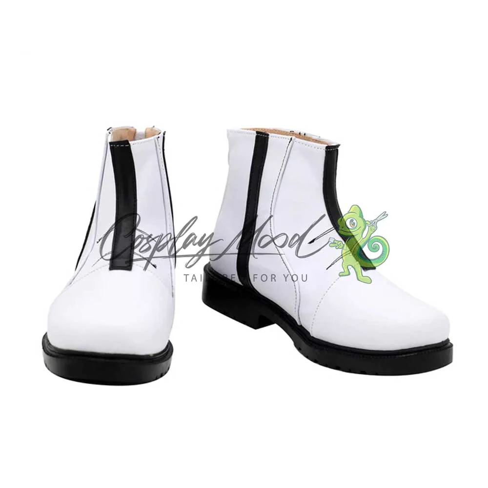 Le scarpe sono realizzate in pelle PU e lavorate con dettagli tipici del personaggio in questione. Questo tipo di calzature sono resistenti ad urti e strappi ed appariranno come da immagine: un paio di stivaletti da uomo bianchi con strisce frontali e laterali di colore nero e suole del medesimo colore. Le nostre calzature cosplay sono fatte su ordinazione, quando il laboratorio finisce di realizzarle verranno spedite immediatamente. Potrebbe accadere che alcuni tipi di scarpe o stivali all’inizio possano avere un forte odore che per alcune persone potrebbe risultare alquanto sgradevole. Questa cosa si risolverà facilmente mettendo le scarpe o gli stivali in un luogo areato per una notte o al massimo per qualche giorno.