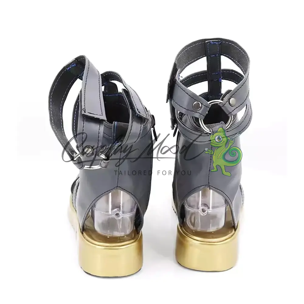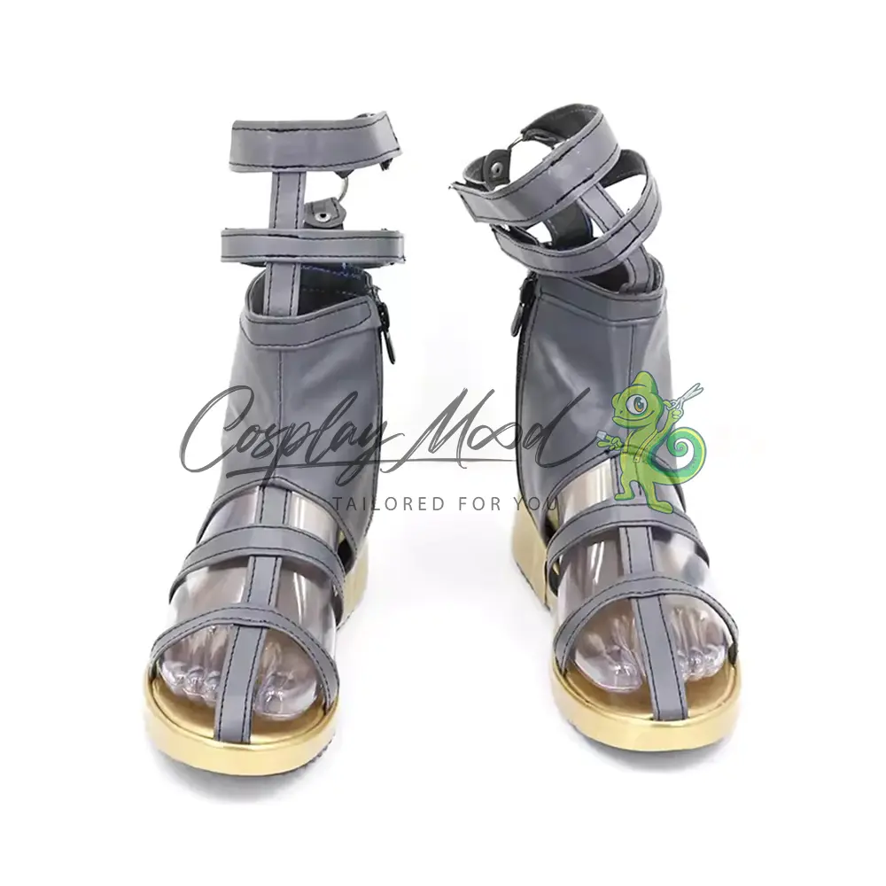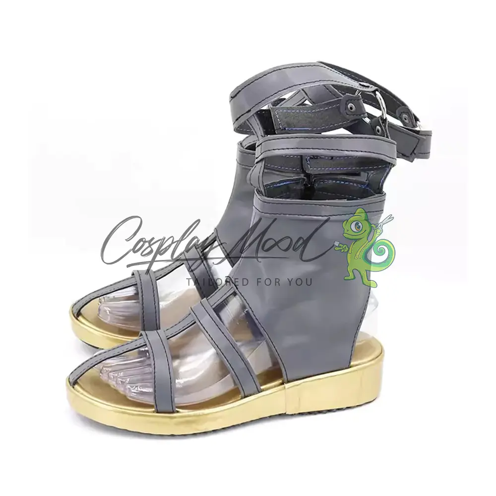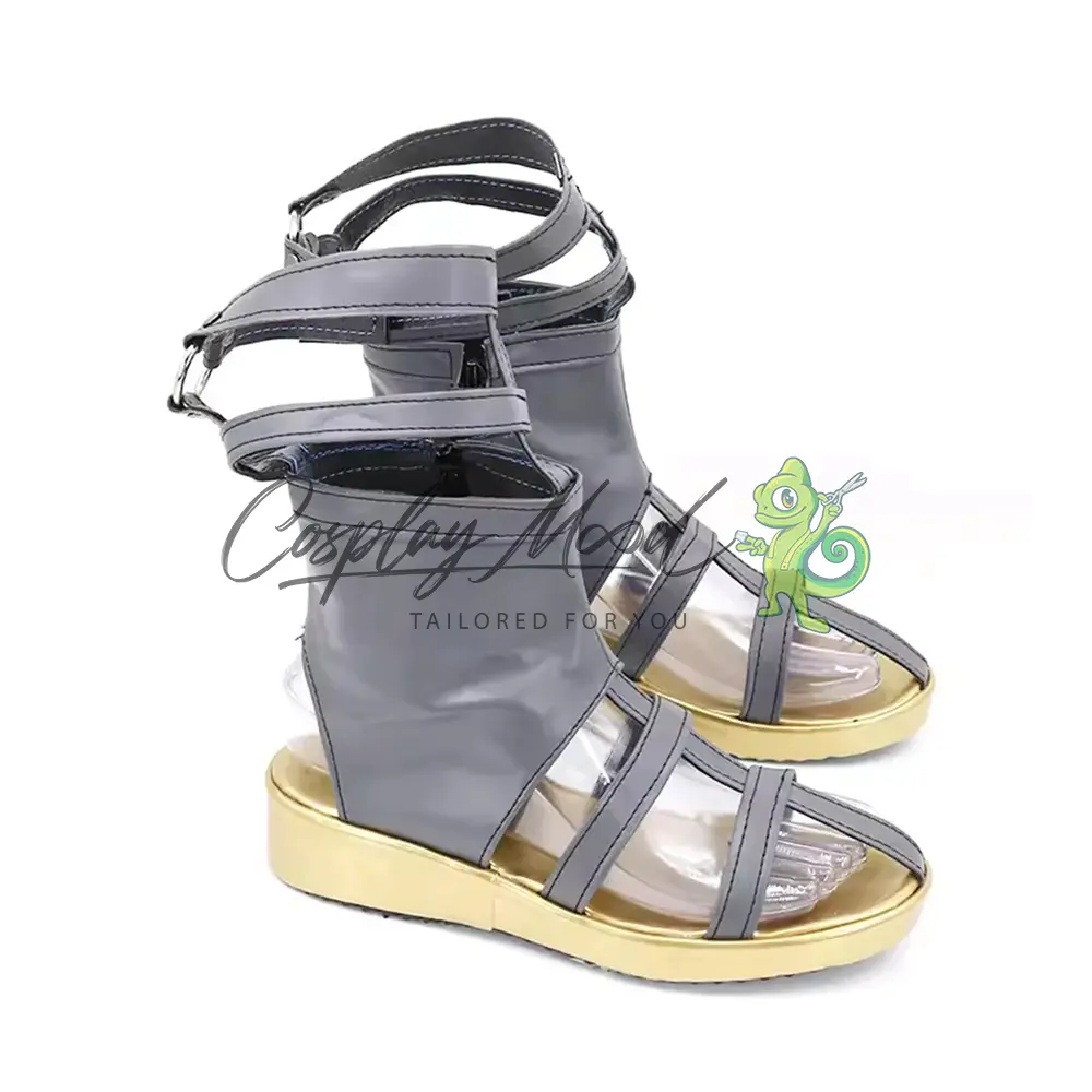 Le nostre calzature sono lavorate in pelle PU ed impreziosite con dettagli tipici del personaggio in questione. Questo tipo di calzature sono resistenti ad urti e strappi ed appariranno come da immagine: un paio di scarpe grigie stile sandalo greco, aperte nella zona frontale e delle dita, sono percorse da una striscia centrale e due laterali. La parte che protegge il collo del piede è tutta coperta, mentre invece il tallone resterà scoperto. Completano delle cinghie nella parte alta sempre di colore grigio.