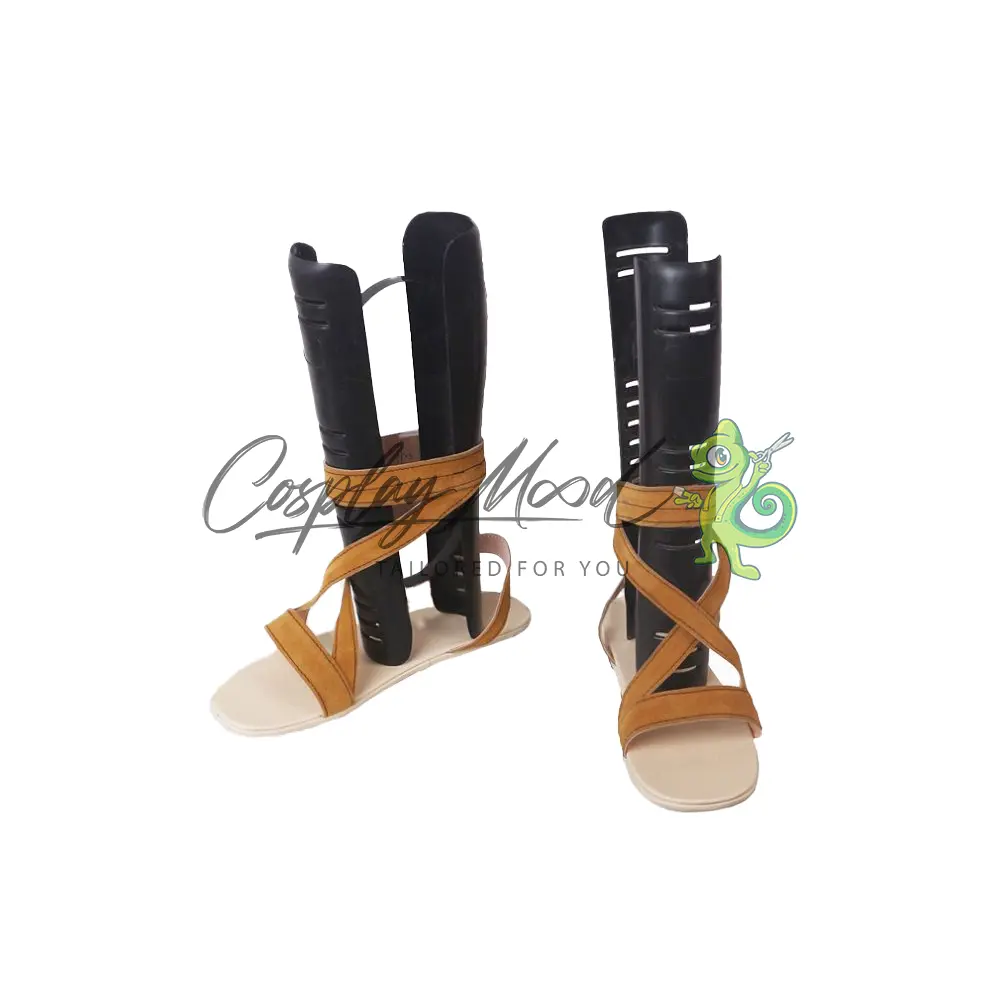 Le scarpe sono realizzate in pelle PU e lavorate con dettagli tipici del personaggio in questione. Questo tipo di calzature sono resistenti ad urti e strappi ed appariranno come da immagine: un paio di sandali marrone chiaro intrecciati con suola color sabbia.