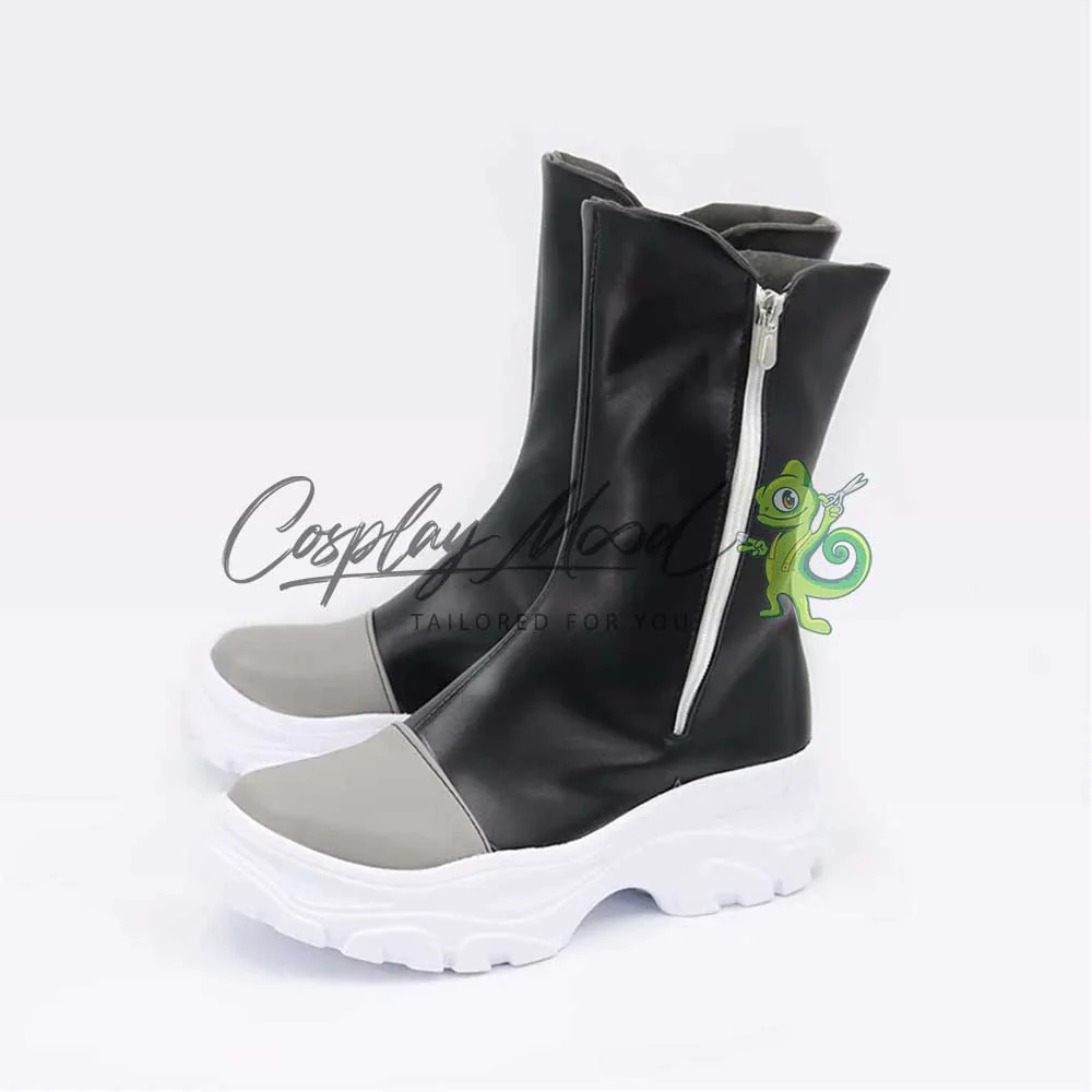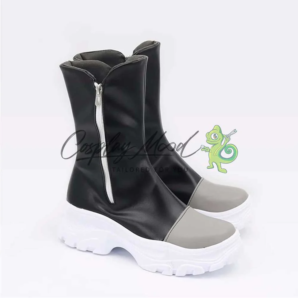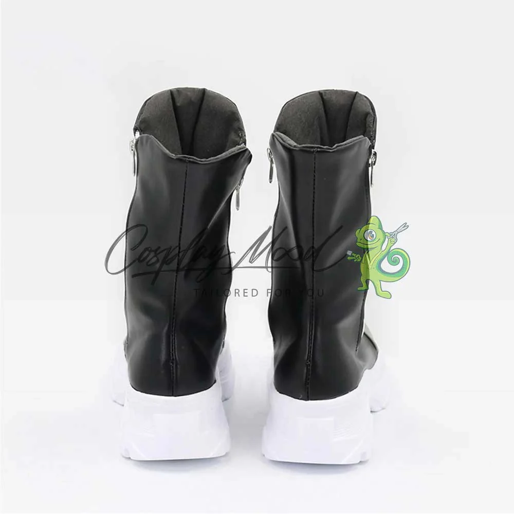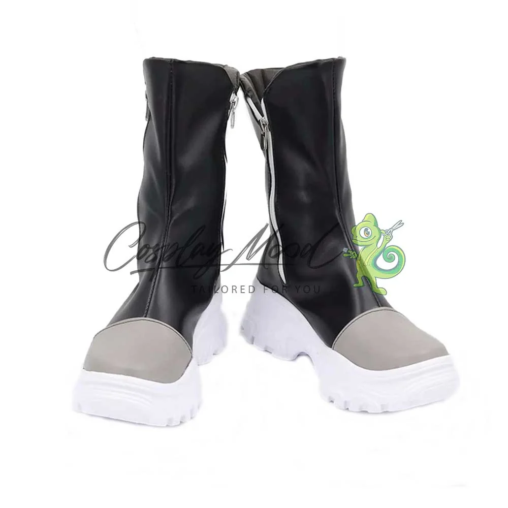 Tutte le nostre calzature sono realizzate in pelle PU e lavorate con dettagli tipici del personaggio in questione. Questo materiale le rende resistenti ad urti e strappi ed appariranno come da immagine: un paio di scarpe nere con una suola bianca rialzata ed una punta grigia. A lato si trova una cerniera bianca a completare la rifinitura.