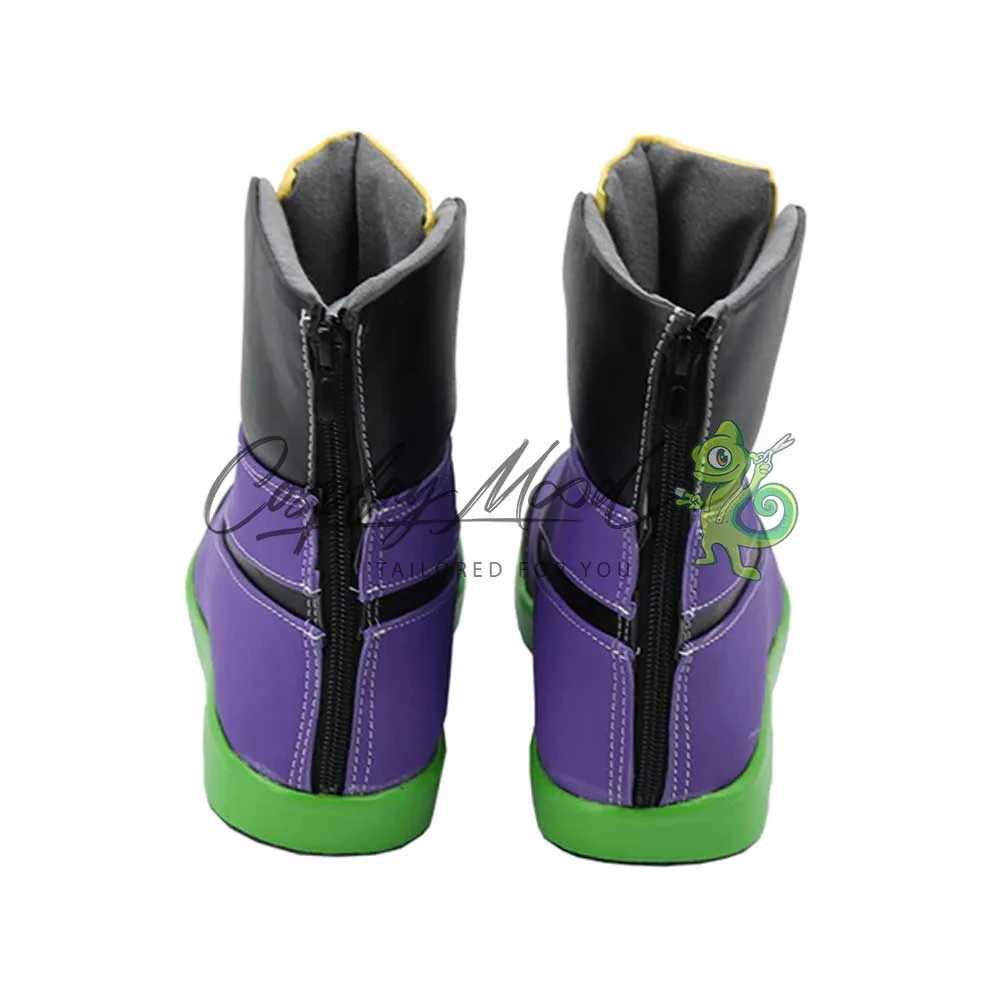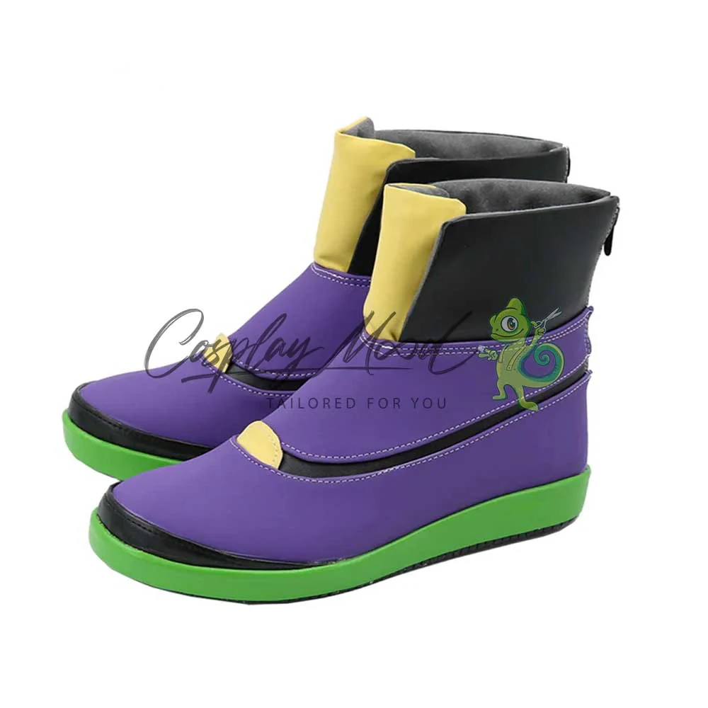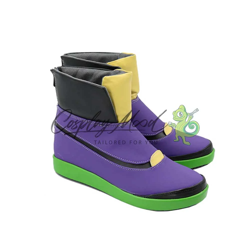 Tutte le nostre calzature sono realizzate in pelle PU e lavorate con dettagli tipici del personaggio in questione. Questo materiale le rende resistenti ad urti e strappi ed appariranno come da immagine: un paio di scarpe ben imbottite di color viola, con suola verde e decorazioni nere e gialle sul fronte ed il fianco. Le nostre calzature cosplay sono fatte su ordinazione, quando il laboratorio finisce di realizzarle verranno spedite immediatamente. Potrebbe accadere che alcuni tipi di scarpe o stivali all’inizio possano emanare un forte odore che per alcune persone potrebbe risultare alquanto sgradevole. Questa cosa si risolverà facilmente mettendo le scarpe o gli stivali in un luogo areato per una notte o al massimo per qualche giorno.