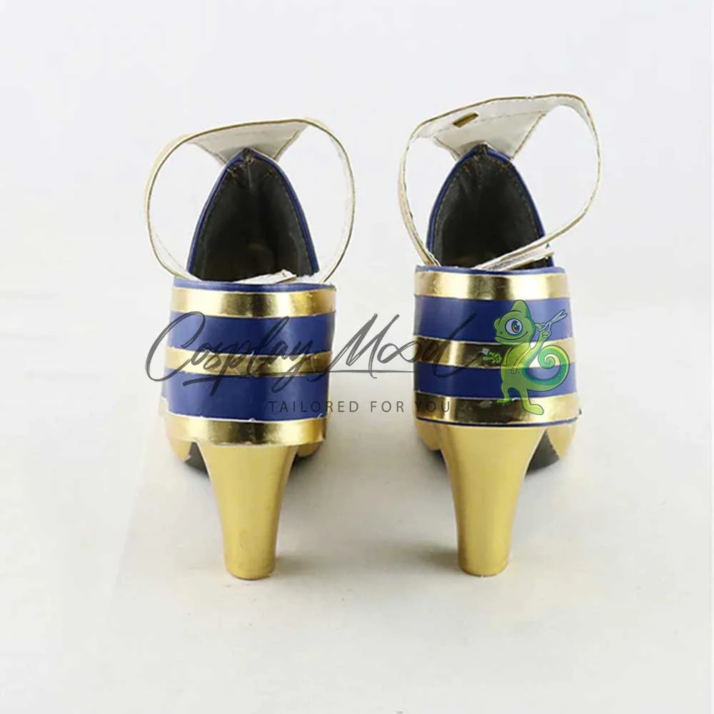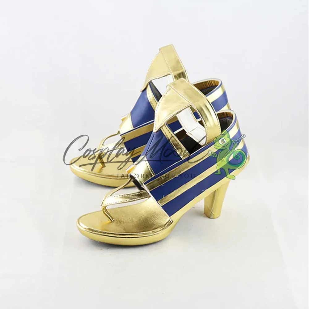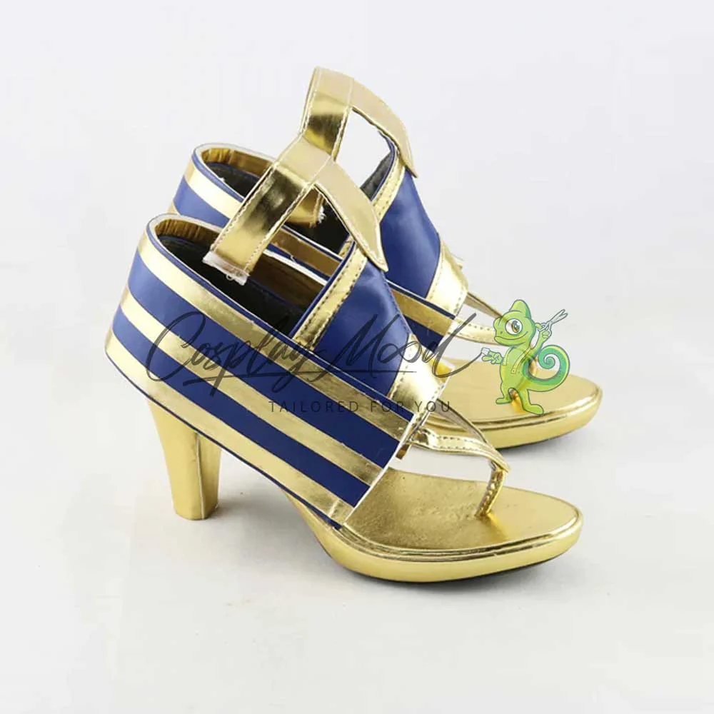 Le scarpe sono realizzate in pelle PU e lavorate con dettagli tipici del personaggio in questione. Questo tipo di calzature sono resistenti ad urti e strappi ed appariranno come da immagine: un paio di scarpe cosplay con il tacco dai colori blu e dorato in puro stile arabo/egizio. Il tallone è protetto da una fascia a righe che si dipana fino davanti alla calzatura. Le dita sono scoperte e divise come nelle infradito, mentre la parte della caviglia è avvolta da decorazioni e da un laccetto per fissare la calzatura alla gamba. Le nostre calzature cosplay sono realizzate su ordinazione, quando il laboratorio finisce di produrle verranno spedite immediatamente, ricordatevi comunque di pianificare la vostra spedizione in modo tale da poterle ricevere in tempo per la fiera a cui vorrete partecipare. Potrebbe accadere che alcuni tipi di scarpe o stivali all’inizio possano avere un forte odore che per alcune persone potrebbe risultare alquanto sgradevole. Questa cosa si risolverà facilmente mettendo le calzature in un luogo areato per una notte o al massimo per qualche giorno.