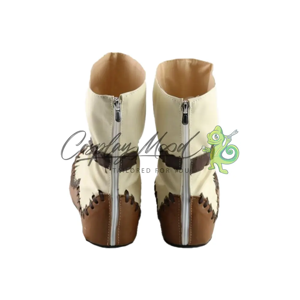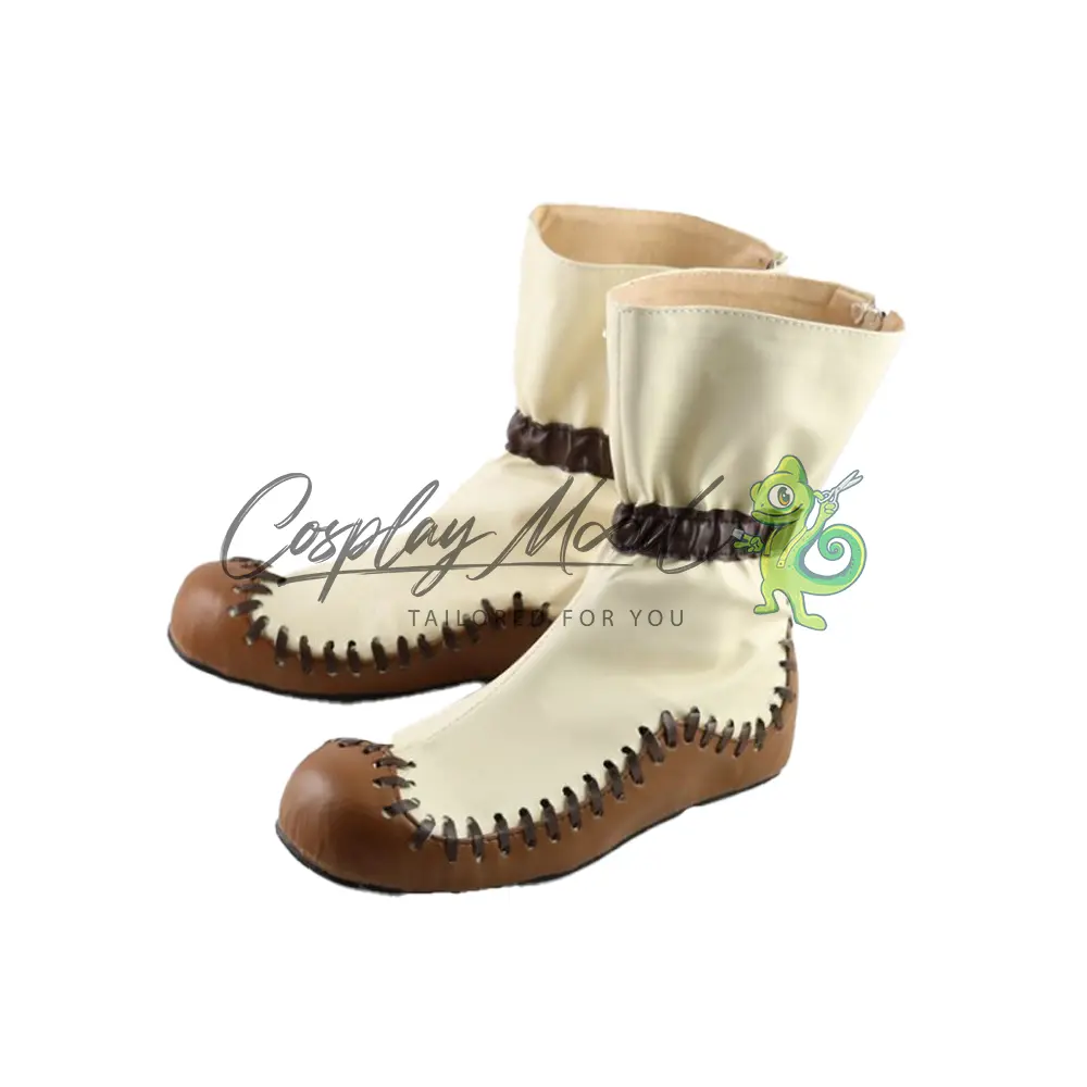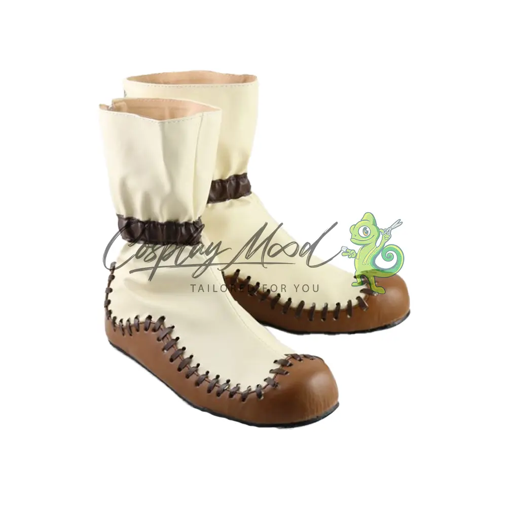 Le scarpe sono realizzate in pelle PU e lavorate con dettagli tipici del personaggio in questione. Questo tipo di calzature sono resistenti ad urti e strappi ed appariranno come da immagine: un paio di scarpe color crema con la parte inferiore marrone sormontata da una cucitura in rilievo e una striscia centrale all’altezza della caviglia color marrone scuro.