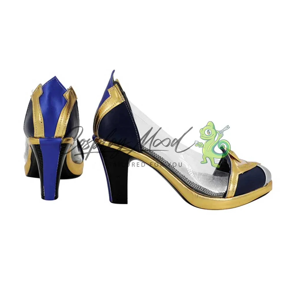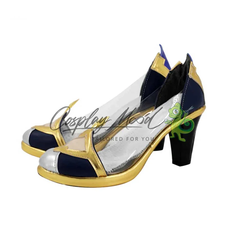 Le scarpe sono realizzate in pelle PU e lavorate con dettagli tipici del personaggio in questione. Questo tipo di calzature sono resistenti ad urti e strappi ed appariranno come da immagine: un paio di scarpe con il tacco color notte, decorate con una striscia blu chiaro sul retro e completate da bordature color oro per tutta la lunghezza delle calzature. Davanti la punta è argentata con una zona sopra le dita esposta. Differenziano dalla versione uno per una parte di contenimento per il piede trasparente che meglio agevola la camminata. Le scarpe cosplay sono fatte su ordinazione, quando il laboratorio finisce di realizzarle verranno spedite immediatamente. Potrebbe accadere che alcuni tipi di scarpe o stivali all’inizio possano avere un forte odore che per alcune persone potrebbe risultare sgradevole. Questa cosa si risolverà facilmente mettendo le scarpe o gli stivali in un luogo areato per qualche giorno.