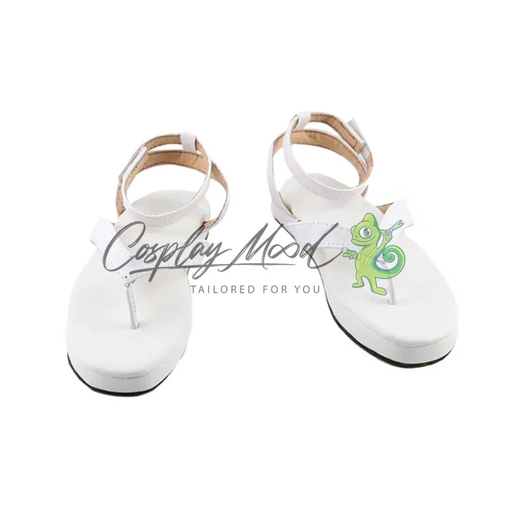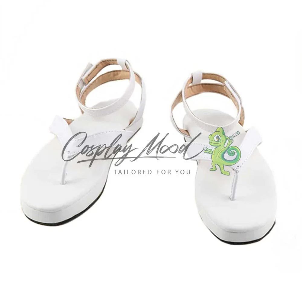 Le scarpe sono realizzate in pelle PU e lavorate con dettagli tipici del personaggio in questione. Questo tipo di calzature sono resistenti ad urti e strappi ed appariranno come da immagine: un paio di ciabattine infradito color bianco e bande dello stesso colore. Le nostre calzature cosplay sono fatte su ordinazione, quando il laboratorio finisce di realizzarle verranno spedite immediatamente. Potrebbe accadere che alcuni tipi di scarpe o stivali all’inizio possano avere un forte odore che per alcune persone potrebbe risultare alquanto sgradevole. Questa cosa si risolverà facilmente mettendo le scarpe o gli stivali in un luogo areato per una notte o al massimo per qualche giorno.