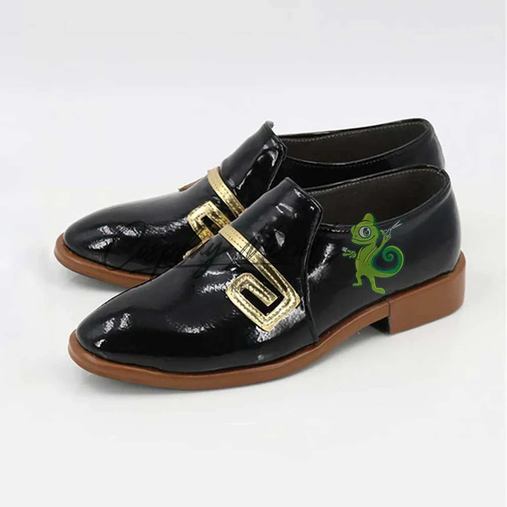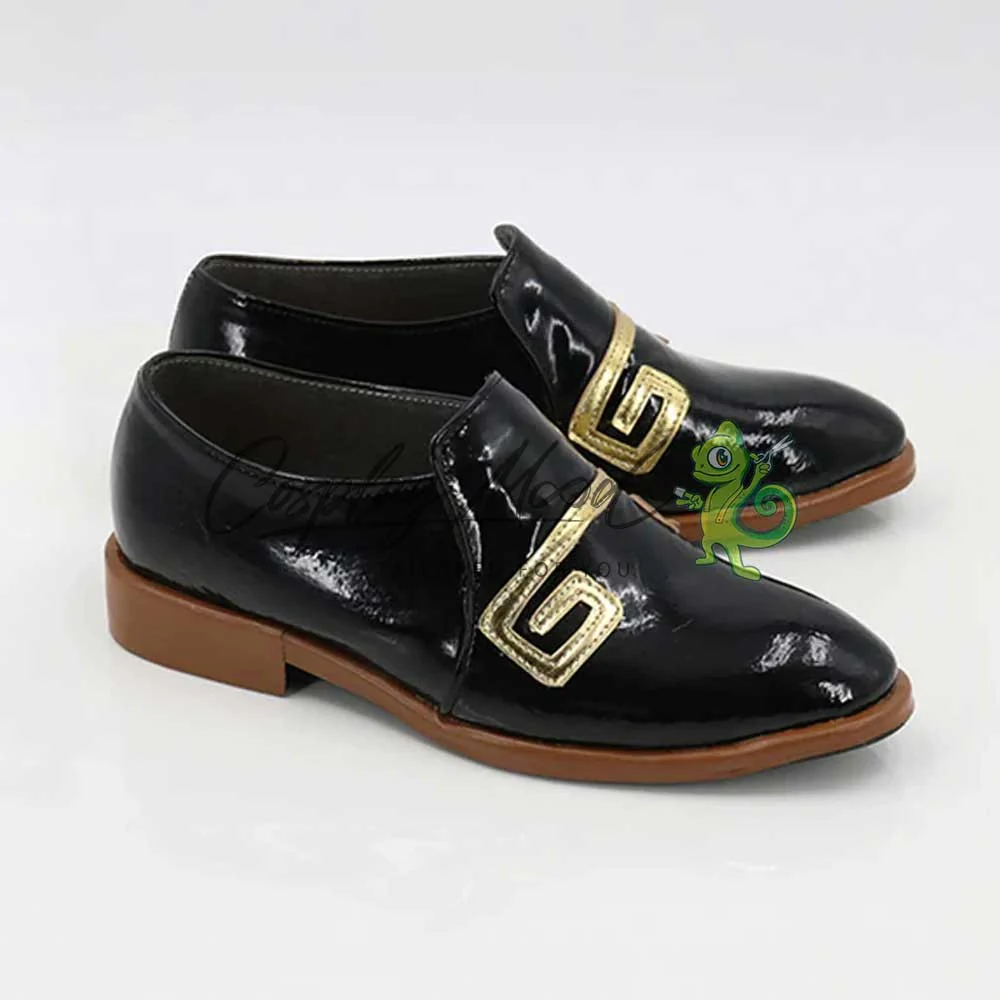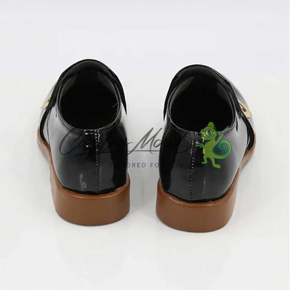 Le scarpe sono realizzate in pelle PU e lavorate con dettagli tipici del personaggio in questione. Questo tipo di calzature sono resistenti ad urti e strappi ed appariranno come da immagine: un paio di mocassini laccati in nero con decorazioni dorate sul fronte. Le scarpe cosplay sono fatte su ordinazione, quando il laboratorio finisce di realizzarle verranno spedite immediatamente. Potrebbe accadere che alcuni tipi di scarpe o stivali all’inizio possano avere un forte odore che per alcune persone potrebbe risultare sgradevole. Questa cosa si risolverà facilmente mettendo le scarpe o gli stivali in un luogo areato per qualche giorno.