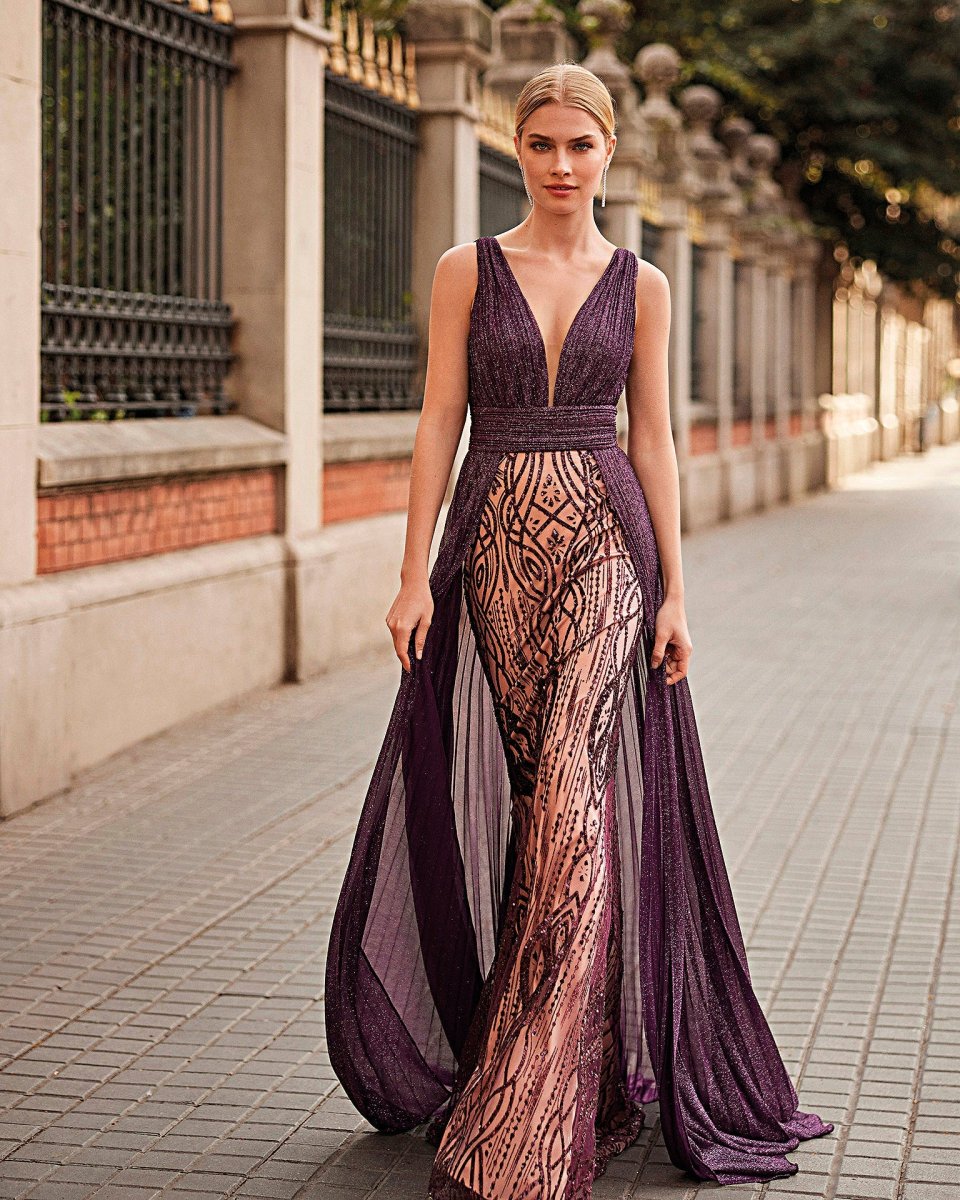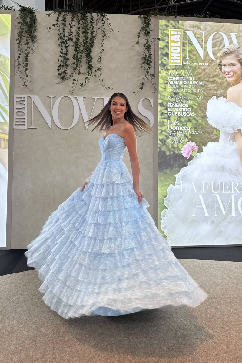 Realizzato in tessuti luminosi dall’effetto cangiante, presenta una gonna scenografica a balze sovrapposte che crea movimento e leggerezza in passerella come in sala. La vestibilità è confortevole ma regale: il punto vita definito valorizza la silhouette, la gonna ampia dona portamento e lascia spazio a passi fluidi. Piccoli riflessi scintillanti accendono il celeste con bagliori sofisticati, perfetti sotto le luci serali.