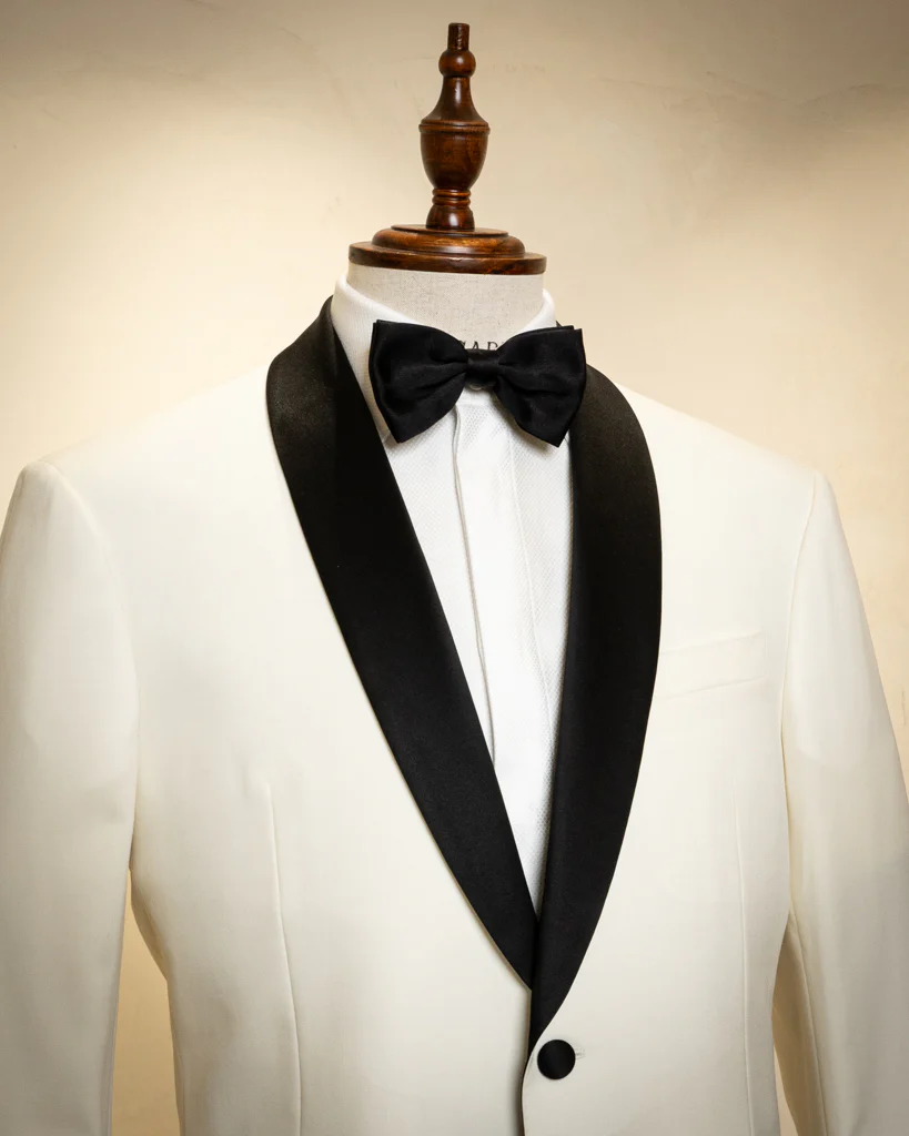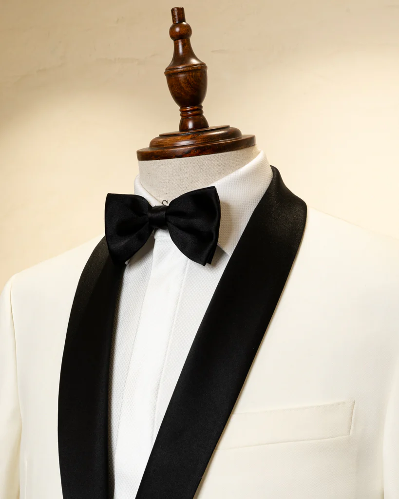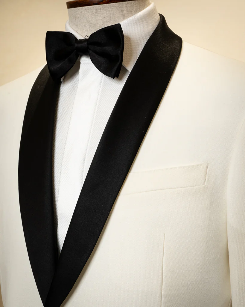 Lo Smoking Donatello è una dichiarazione di stile audace e raffinata. La giacca a due bottoni si distingue per l’iconico rever sciallato, che per l’occasione viene interamente ricoperto in raso nero, creando un distacco netto e lussuoso con il corpo bianco ottico della giacca. Questo gioco di contrasti prosegue nei dettagli tecnici: le tasche a filetto e i bottoni coperti sono anch’essi rifiniti in raso nero, trasformando ogni elemento funzionale in un ornamento sartoriale.