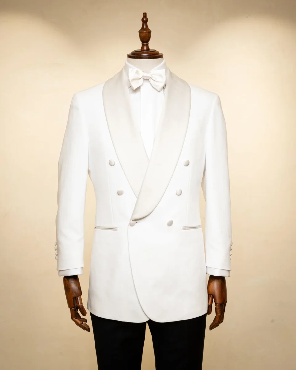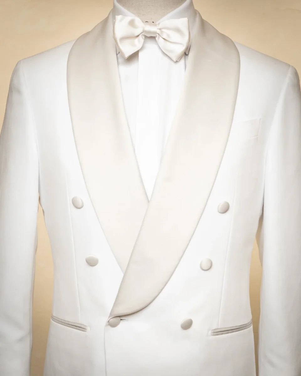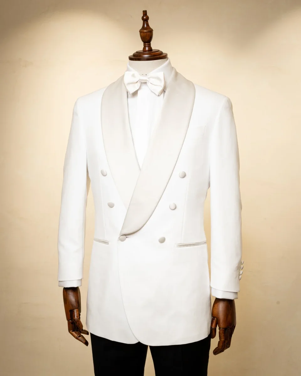 Smoking Bianco Doppiopetto con Rever Sciallato: Eleganza per Cerimonie