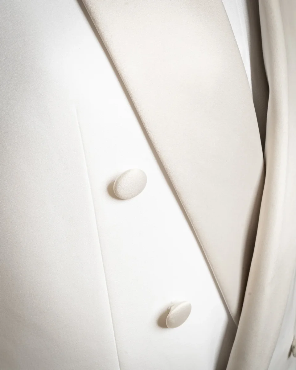 - Bottoni Foderati in Raso: I bottoni sono foderati in raso bianco, creando un effetto visivo omogeneo e raffinato, perfetto per un evento formale.