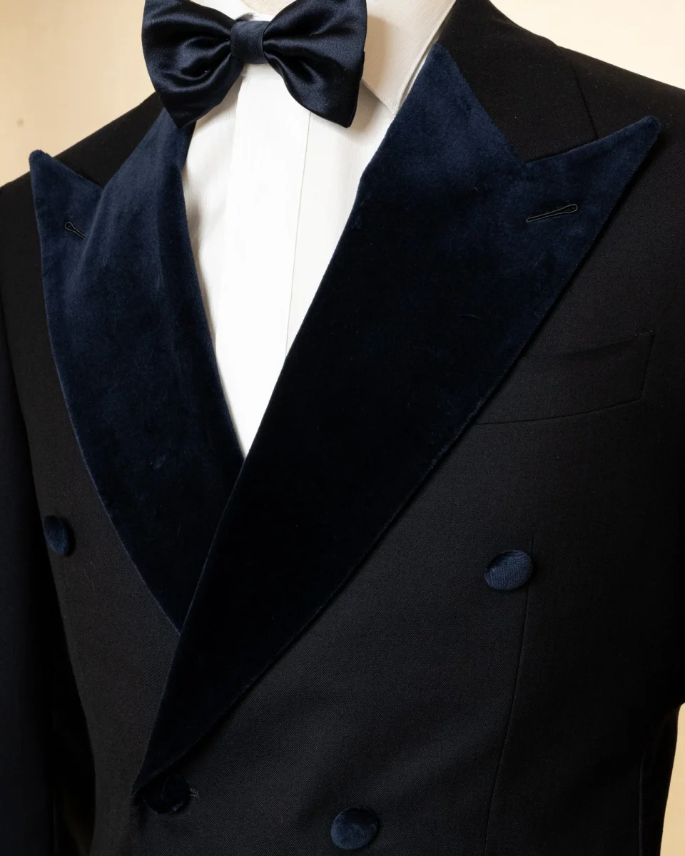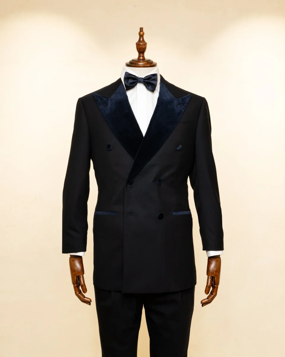 La costruzione doppiopetto e l’assenza di spacchi conferiscono a questo smoking una struttura solida e scultorea, perfetta per le occasioni più esclusive.