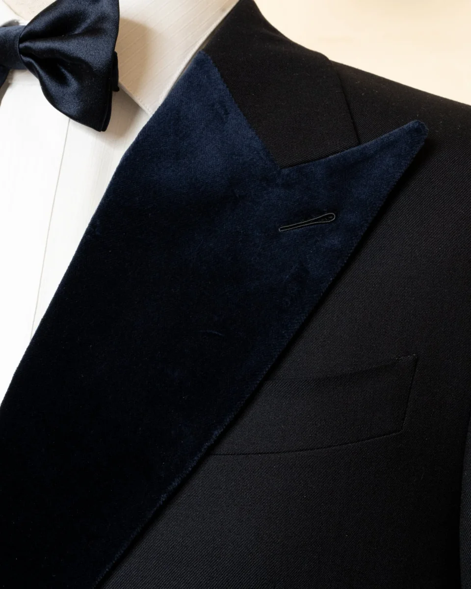 Lo Smoking Canova Blu Ardesia con Velluto Blu è una celebrazione del contrasto materico. La base in lana dalla grana minerale e opaca dell’Ardesia incontra la lucentezza profonda e tattile del velluto, creando un capo da cerimonia che esce dagli schemi del raso tradizionale per abbracciare un’eleganza aristocratica e contemporanea.