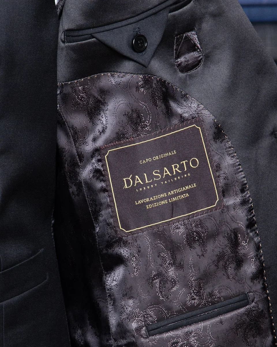 - Materiali: Pregiato Fresco di Lana Super 130s con inserti in raso di seta.