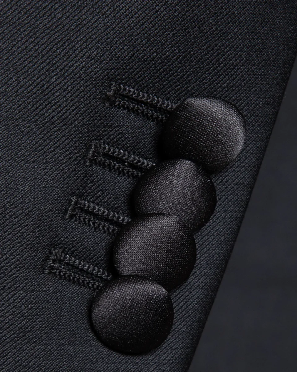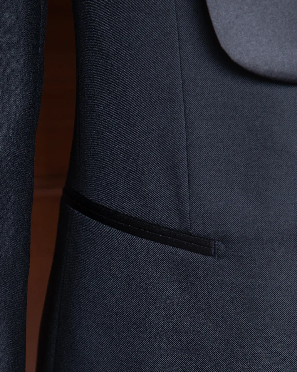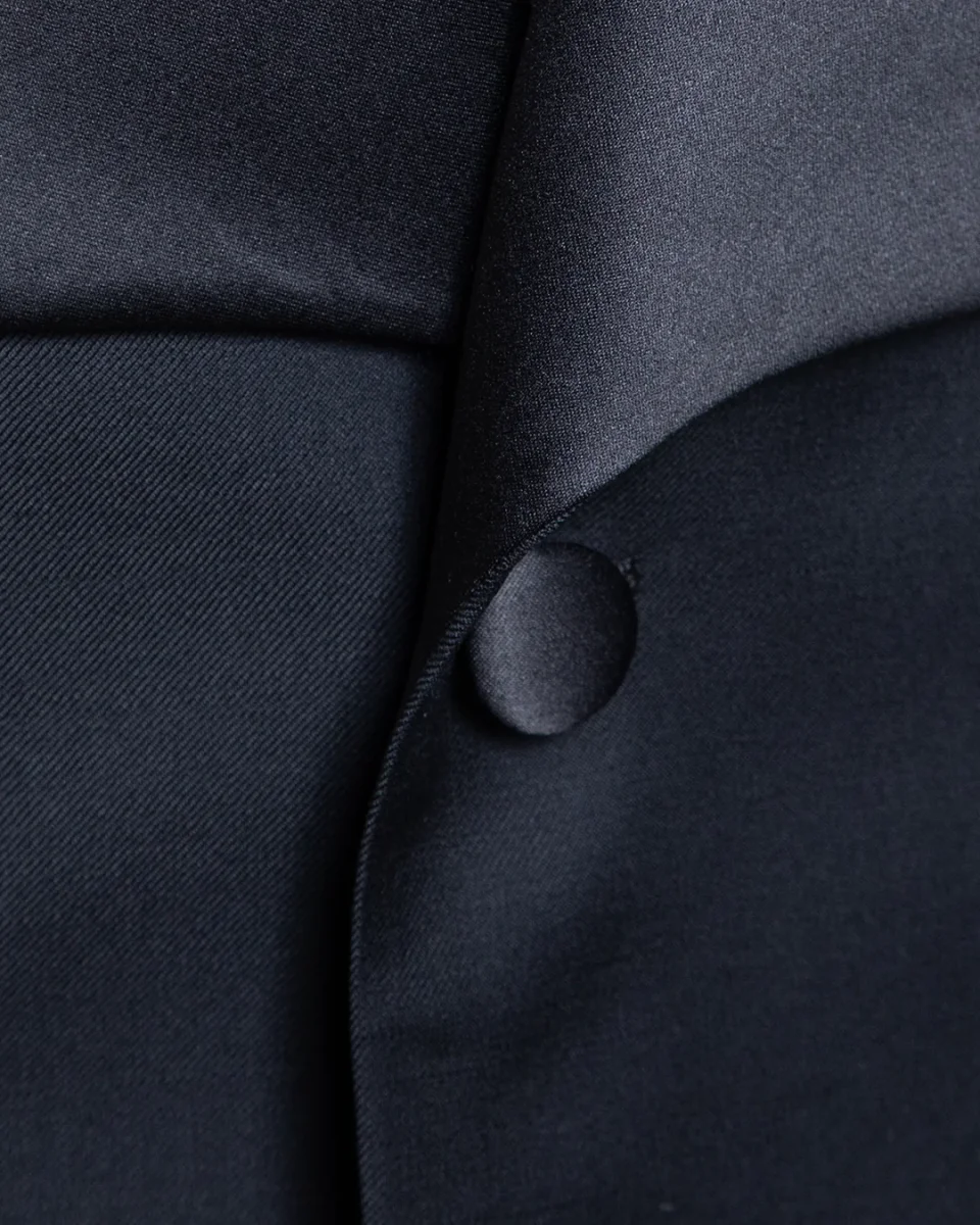 Il setoso contrasto del raso nero definisce non solo il rever, ma anche le tasche a filetto e il singolo bottone centrale, elementi che fungono da punti luce su una struttura di assoluto rigore.