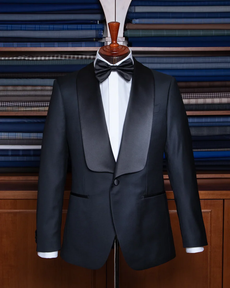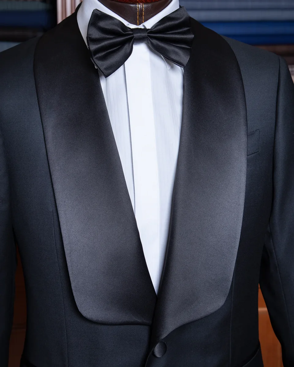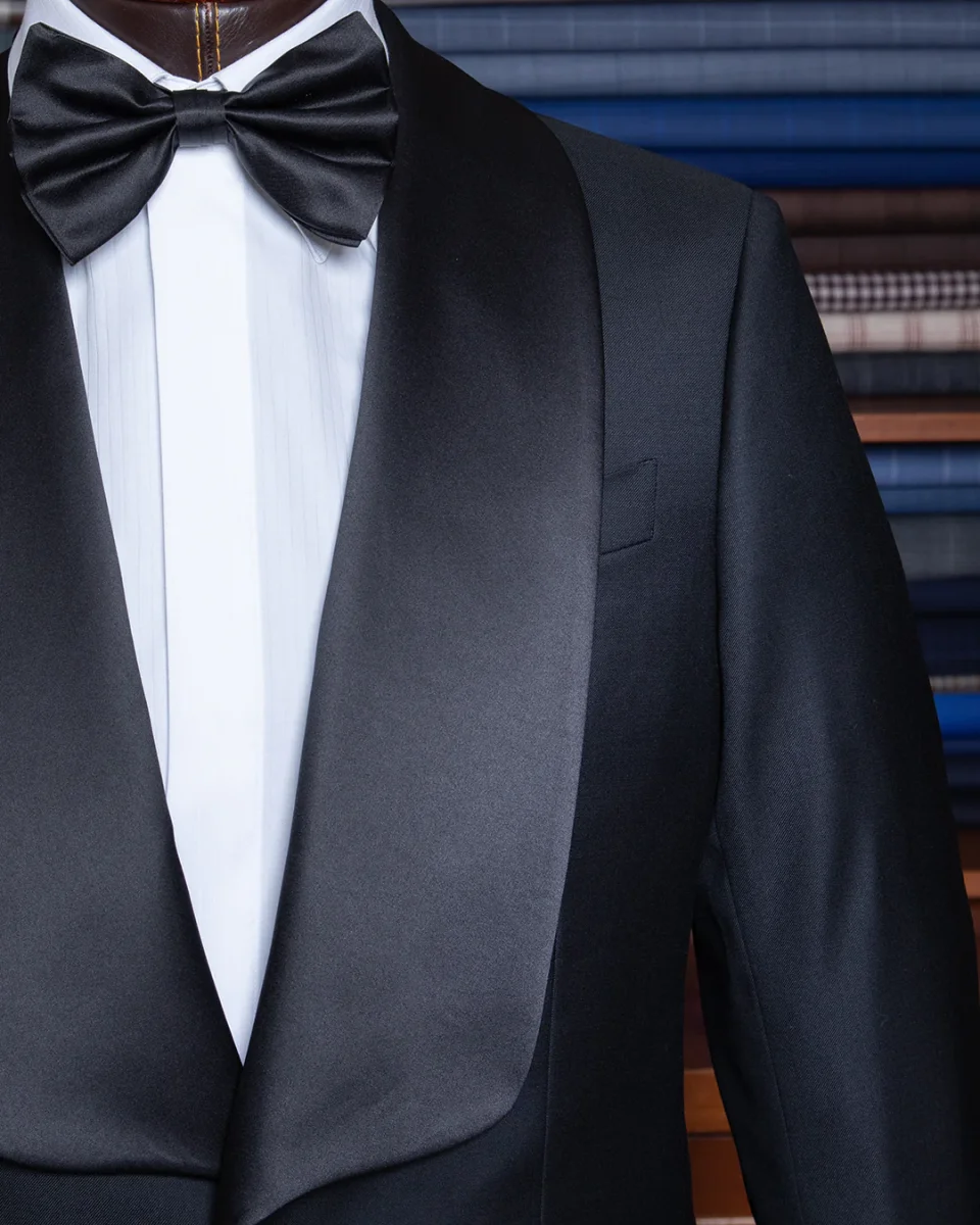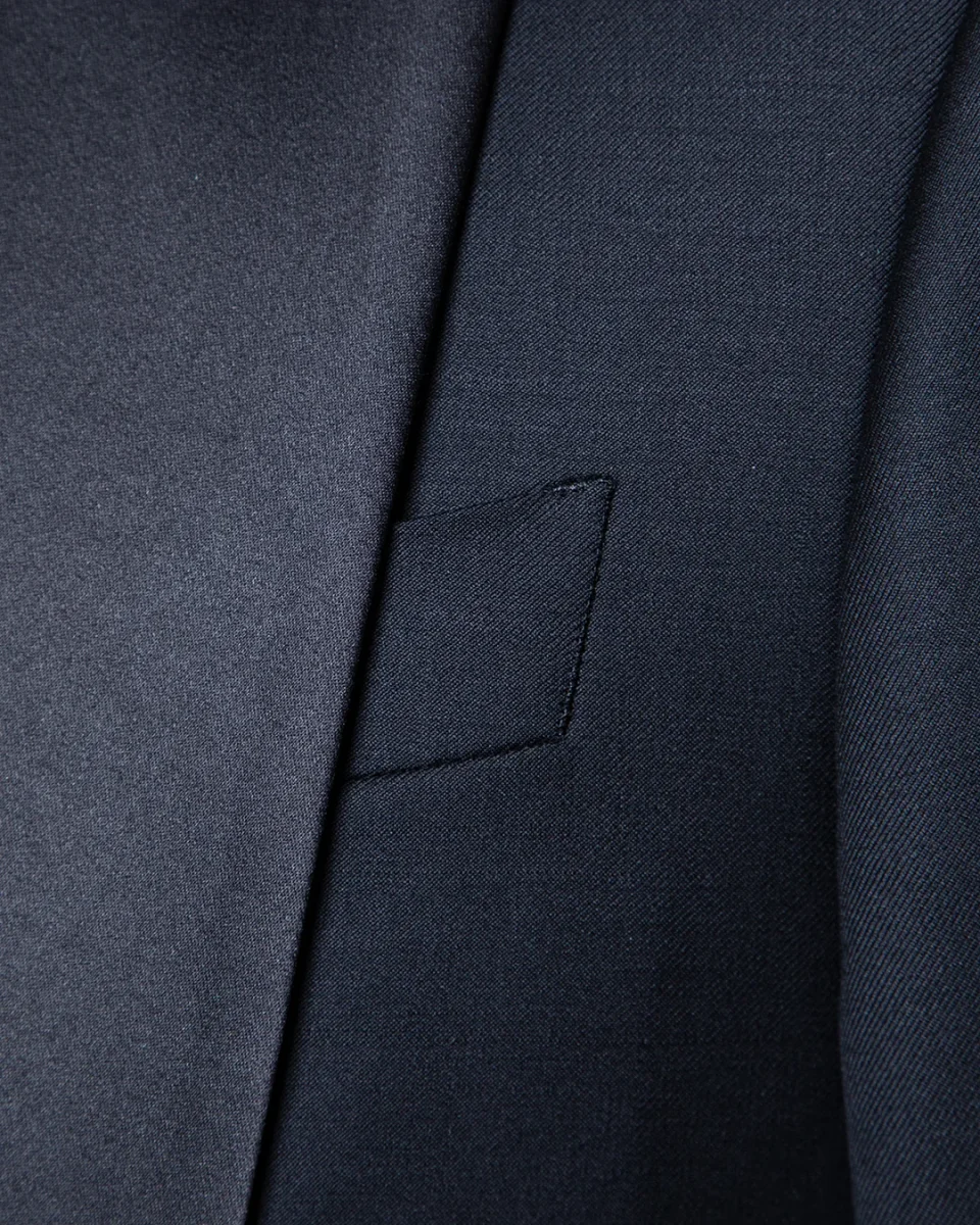 Il setoso contrasto del raso nero definisce non solo il rever, ma anche le tasche a filetto e il singolo bottone centrale, elementi che fungono da punti luce su una struttura di assoluto rigore.