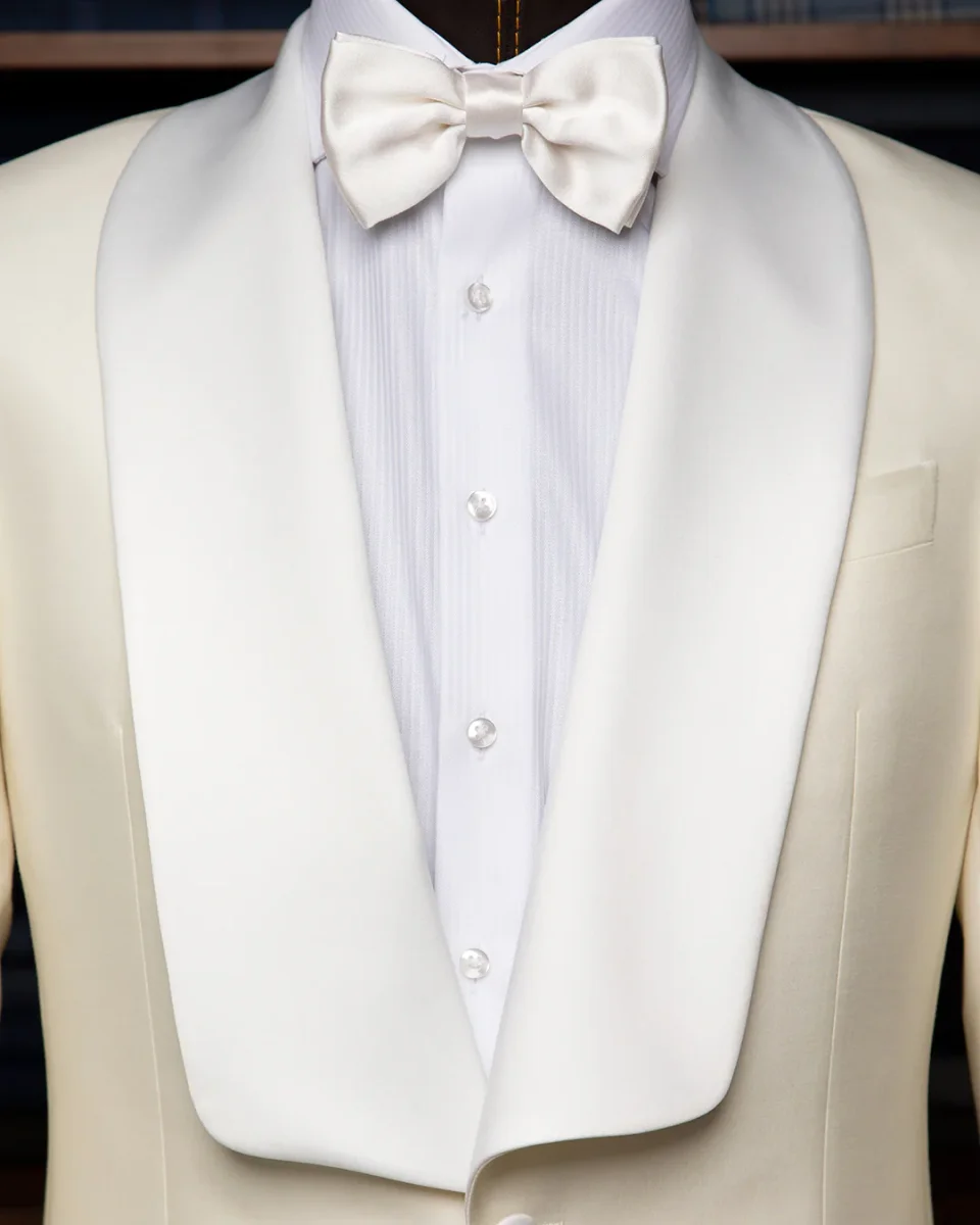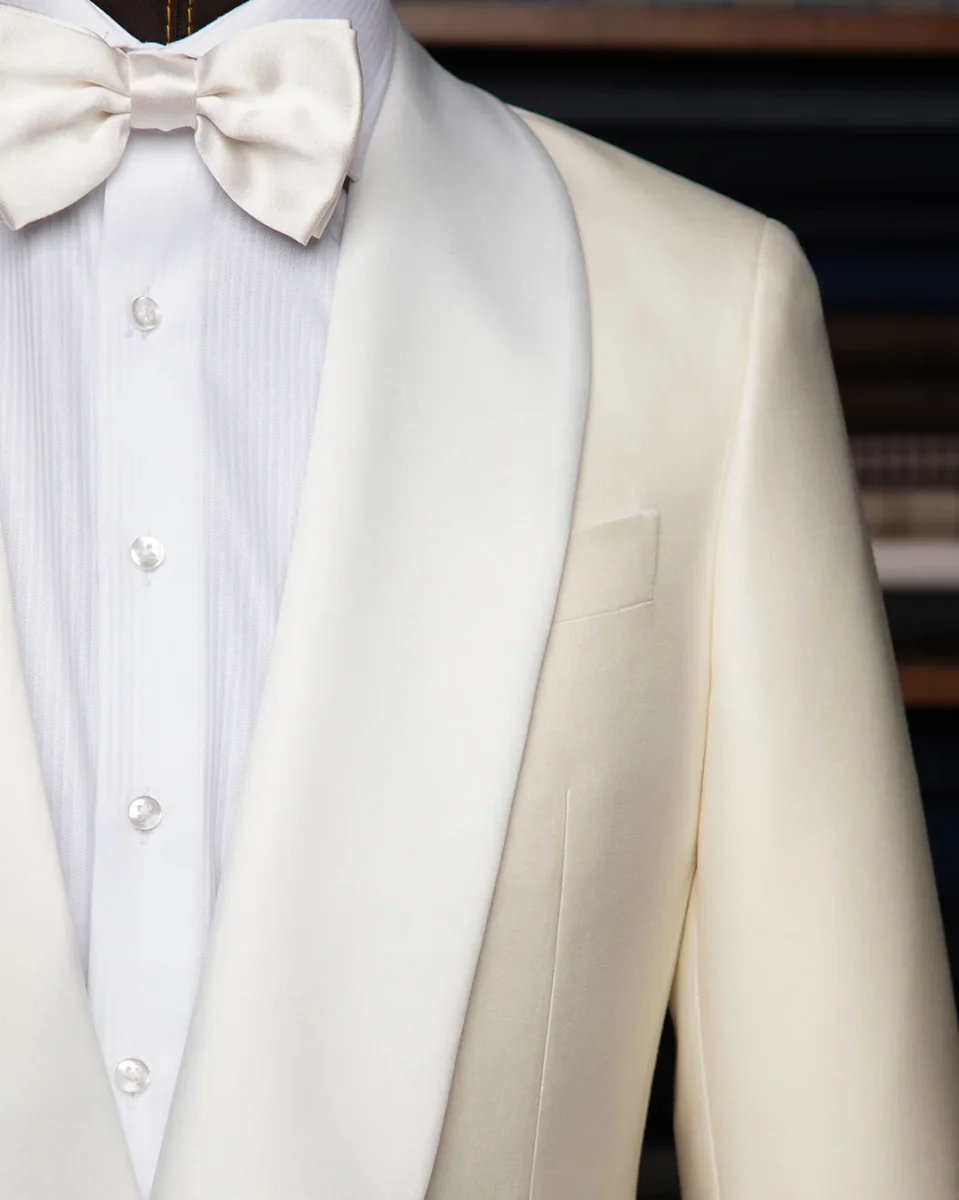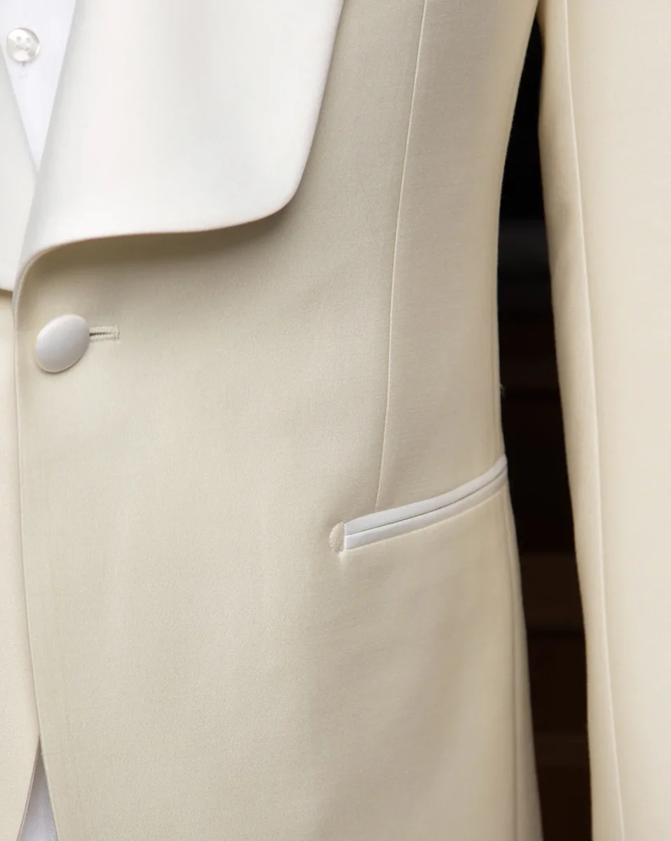 Realizzato con tessuto crema di altissima qualità, questo smoking è il simbolo della perfezione artigianale e della maestria sartoriale, garantendo una presenza impeccabile in ogni occasione cerimoniale.