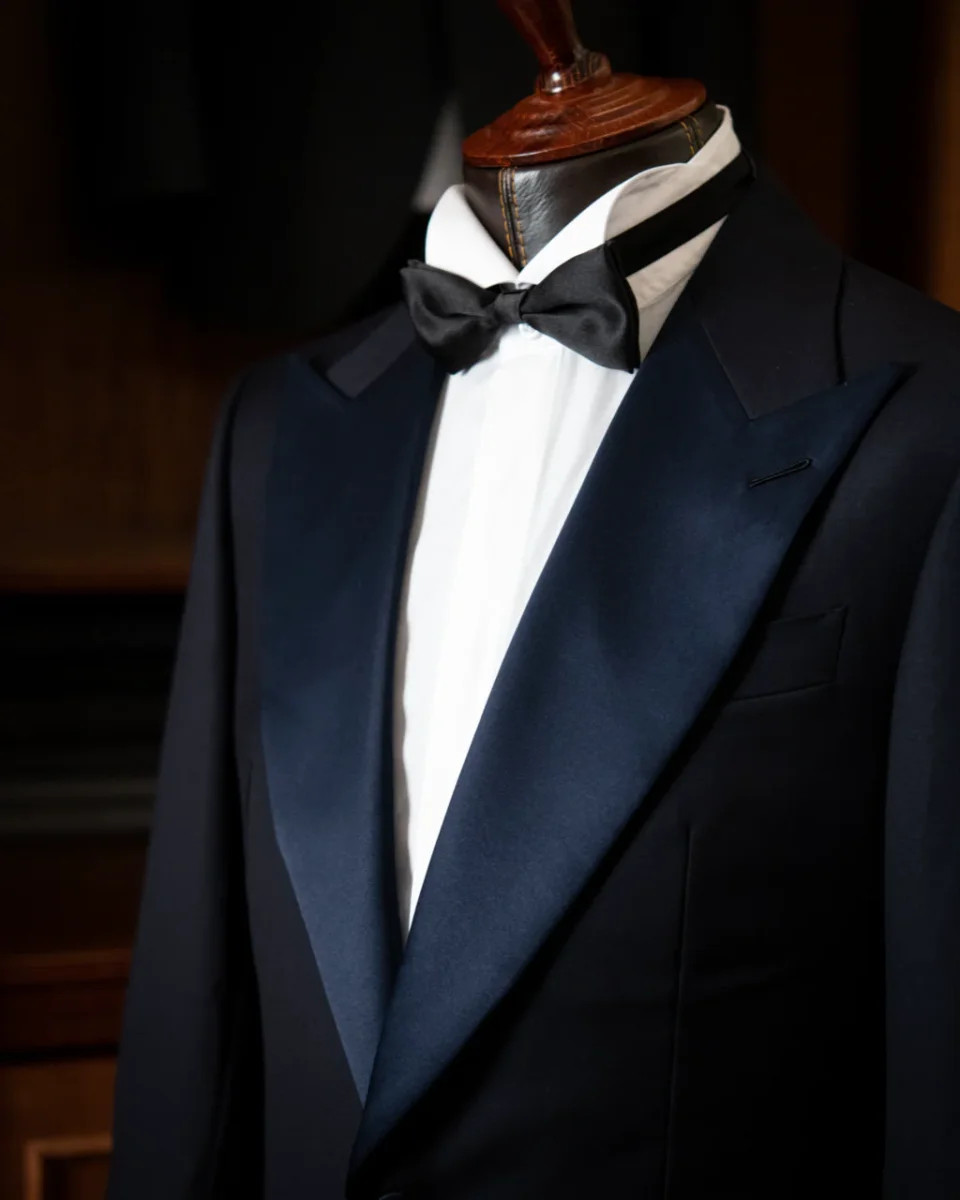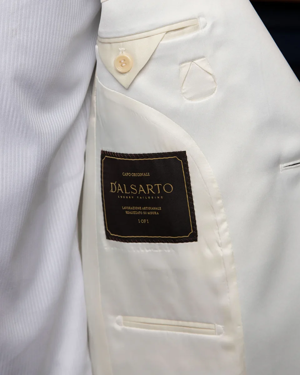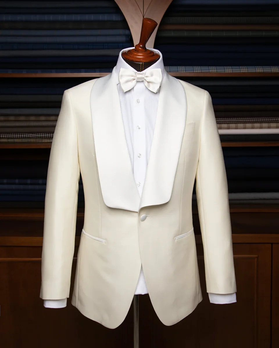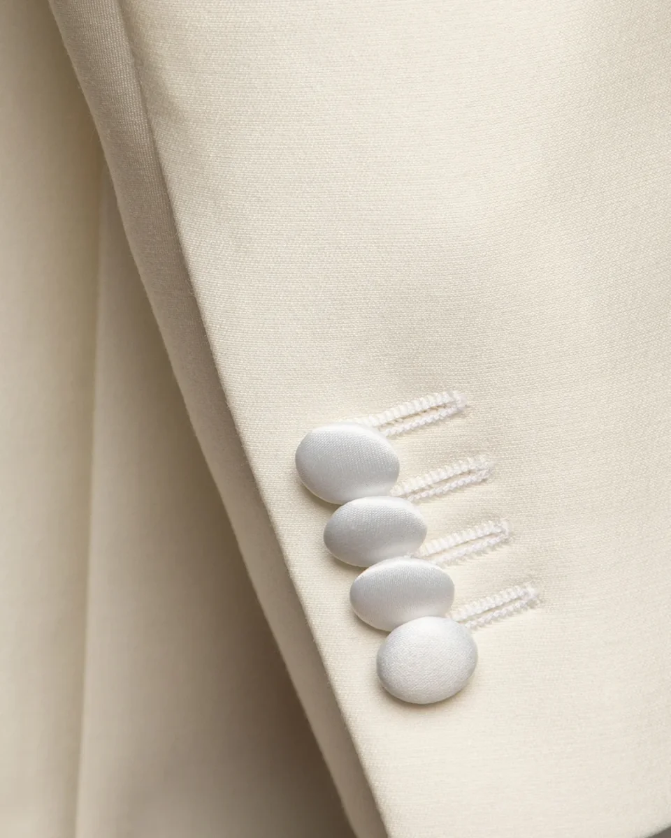 Realizzato con tessuto crema di altissima qualità, questo smoking è il simbolo della perfezione artigianale e della maestria sartoriale, garantendo una presenza impeccabile in ogni occasione cerimoniale.