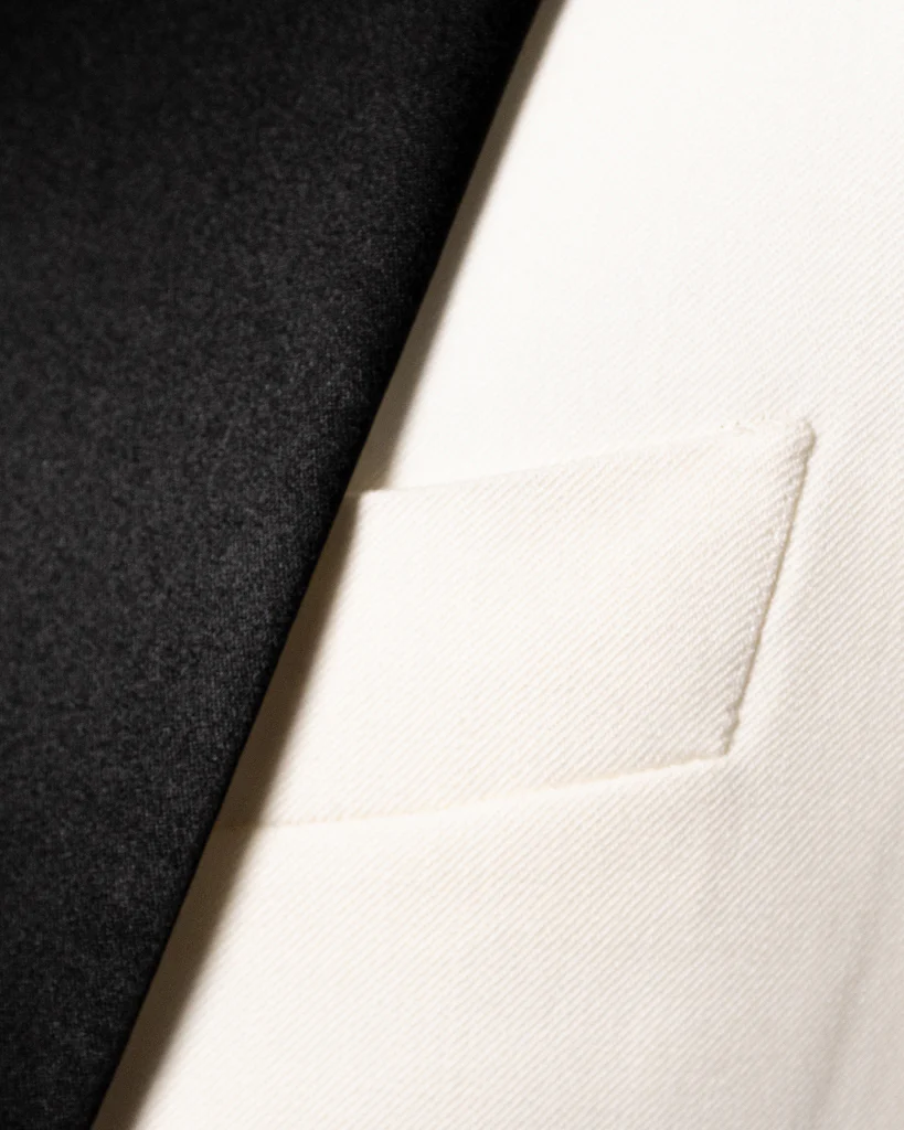 - Giacca Bianca e Pantaloni Neri: La giacca è realizzata in tessuto bianco di alta qualità, mentre i pantaloni sono in tessuto nero, creando un elegante contrasto bicolore.