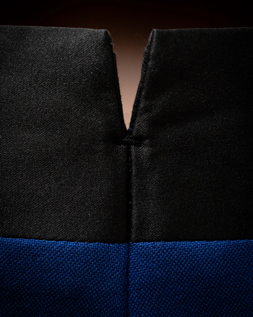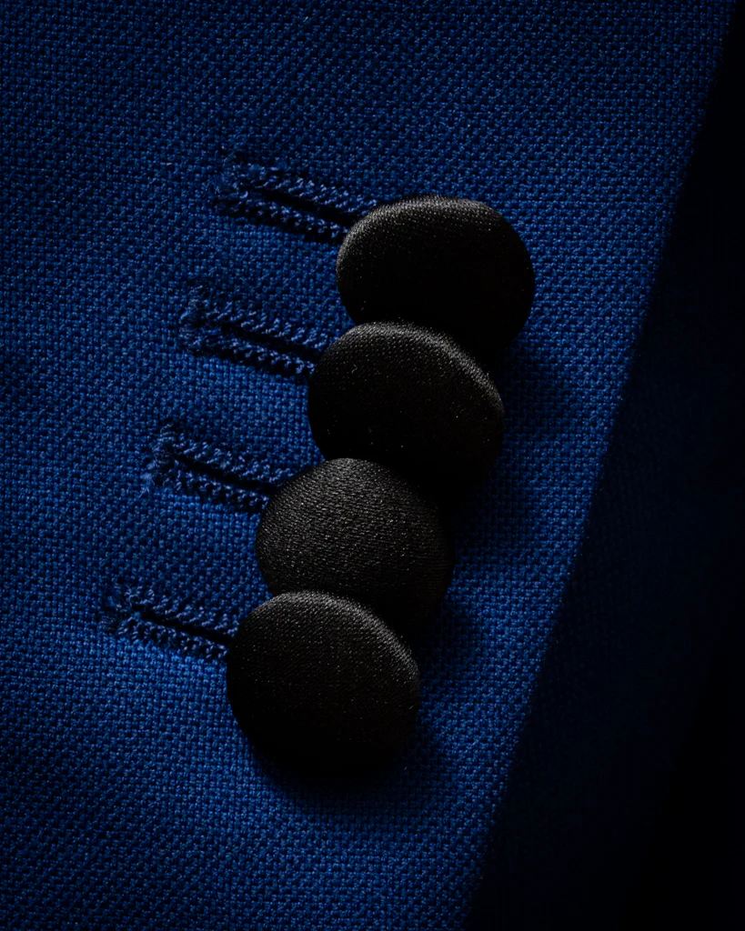 Il modello Donatello eleva il concetto di smoking attraverso un gioco di contrasti cromatici e tattili. Il tessuto base, un Blu Acceso dalla trama Hopsack , funge da palcoscenico per i dettagli in Raso Nero. Il risultato è un abito che brilla di luce propria, dove il calore del blu elettrico viene disciplinato dal rigore lucido della seta nera.