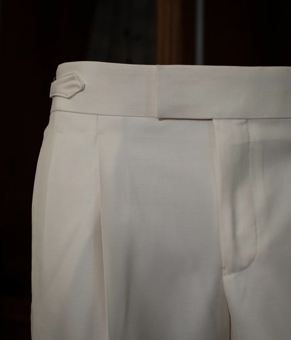 - Pantalone: Design ultra-pulito senza bottoni a vista e senza passanti, con regolazione tramite tirantini laterali per una linea del bacino sartoriale e ininterrotta.