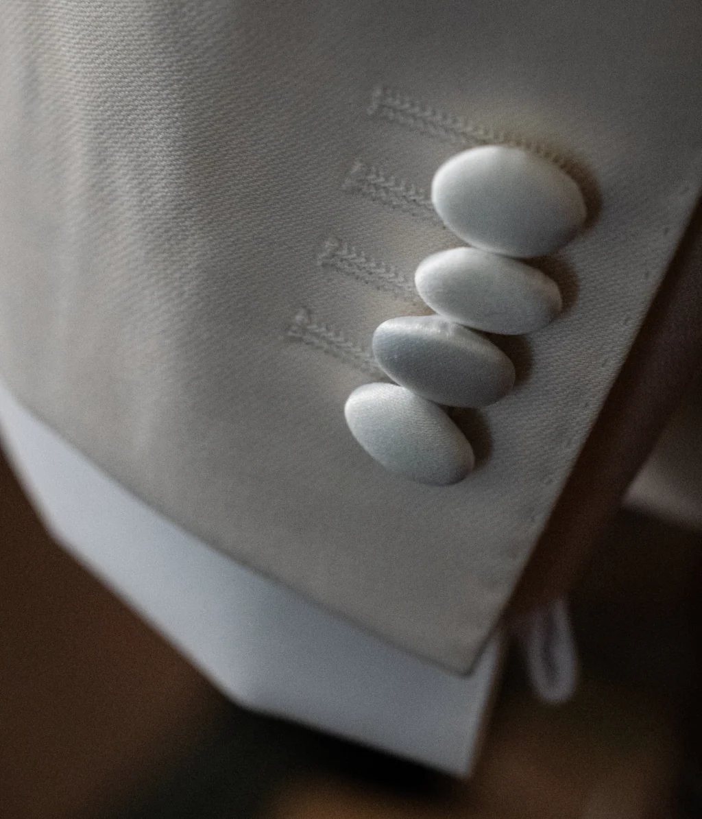 - Finiture: Bottone coperto nello stesso tessuto della giacca, per una continuità visiva impeccabile.