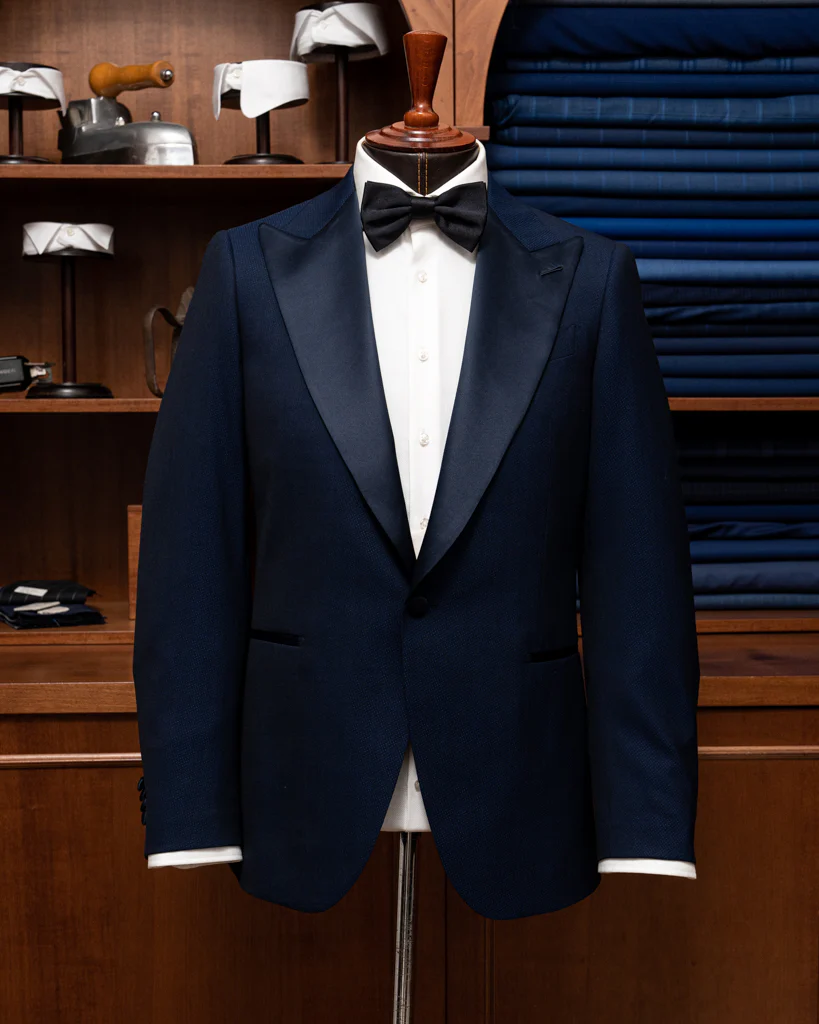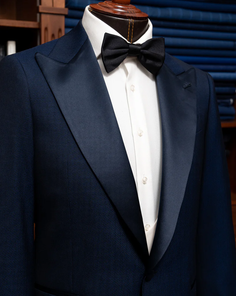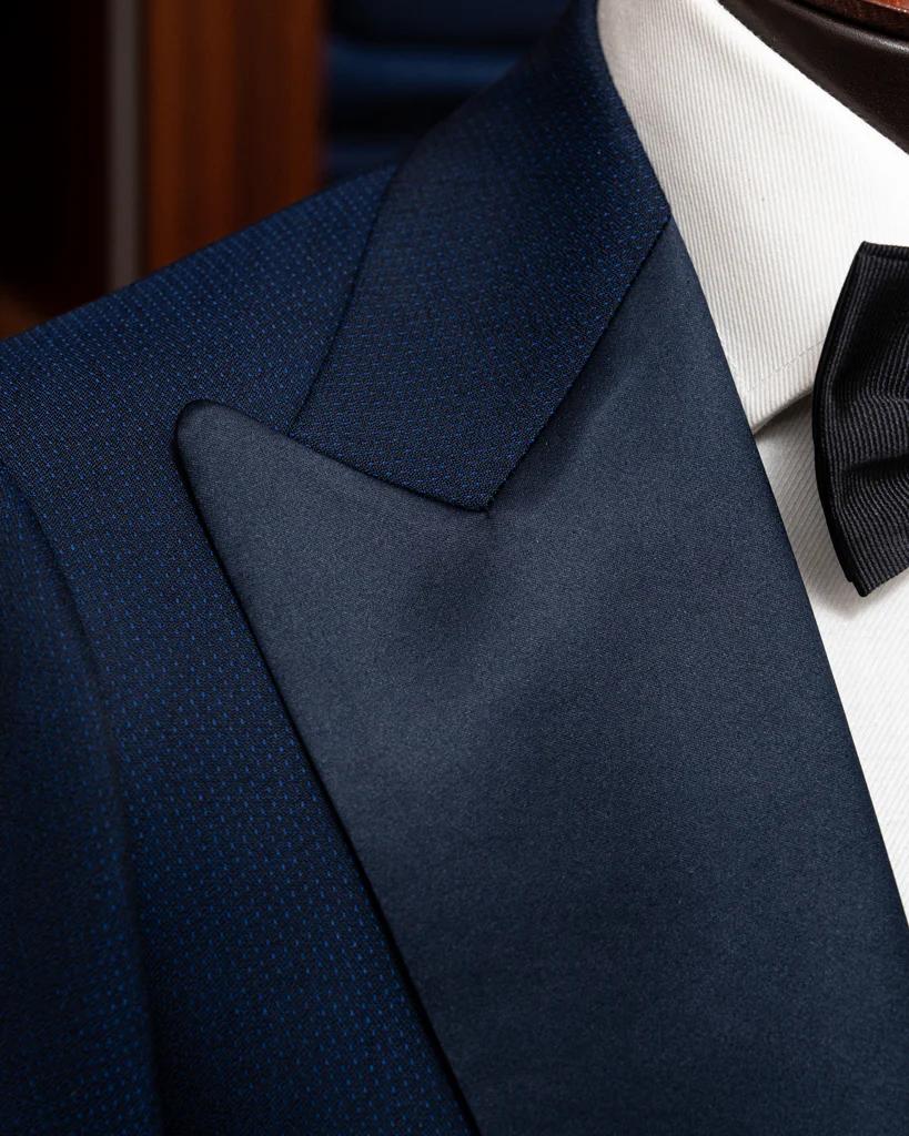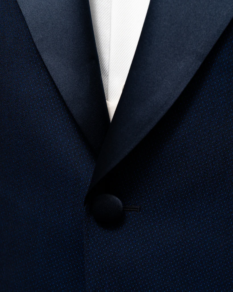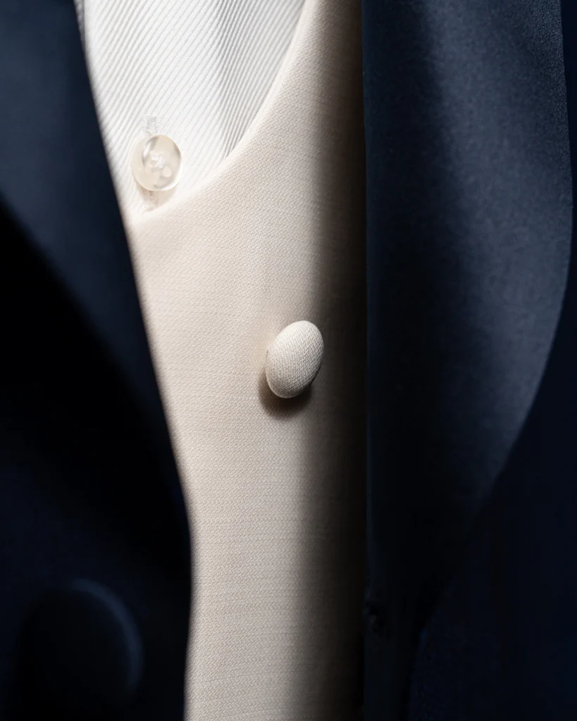 - Pantaloni con Due Pinces e Banda in Raso Blu: I pantaloni sono progettati per garantire il massimo comfort e una vestibilità perfetta grazie alle due pinces. La banda in raso blu aggiunge un elemento di continuità stilistica con la giacca, mentre la mancanza di passanti per la cintura enfatizza una linea pulita e raffinata.