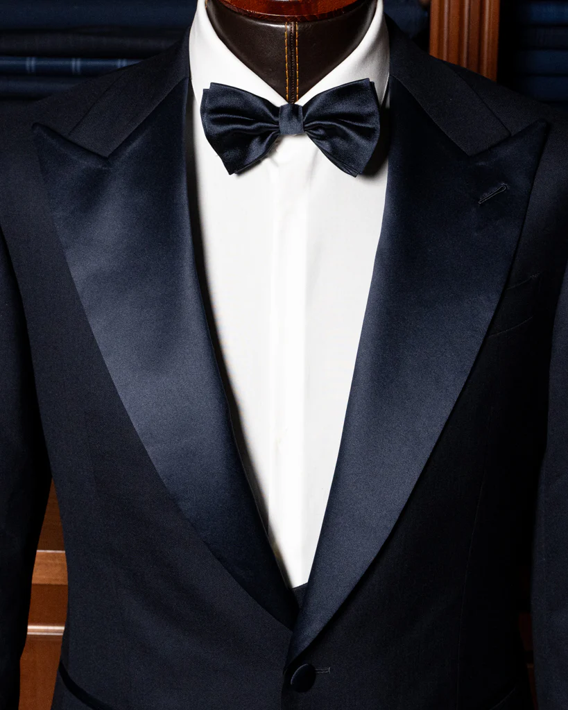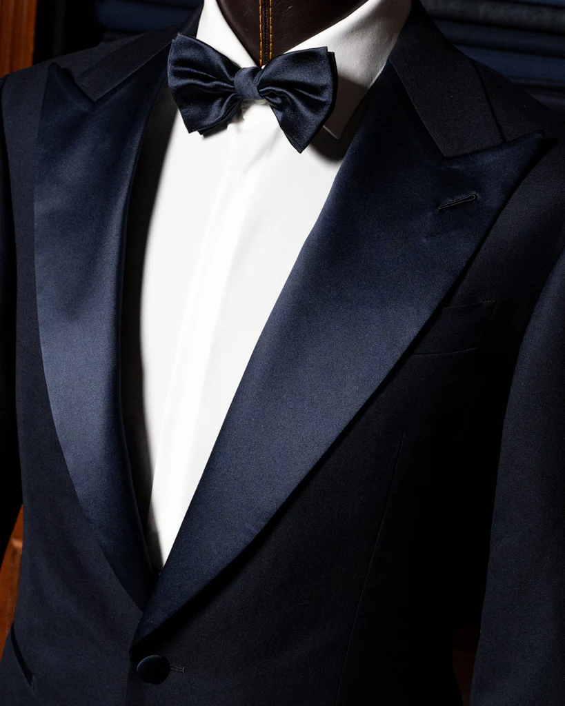 - Giacca: Modello Smoking a 1 bottone con Rever a Lancia in pregiato Raso Blu.