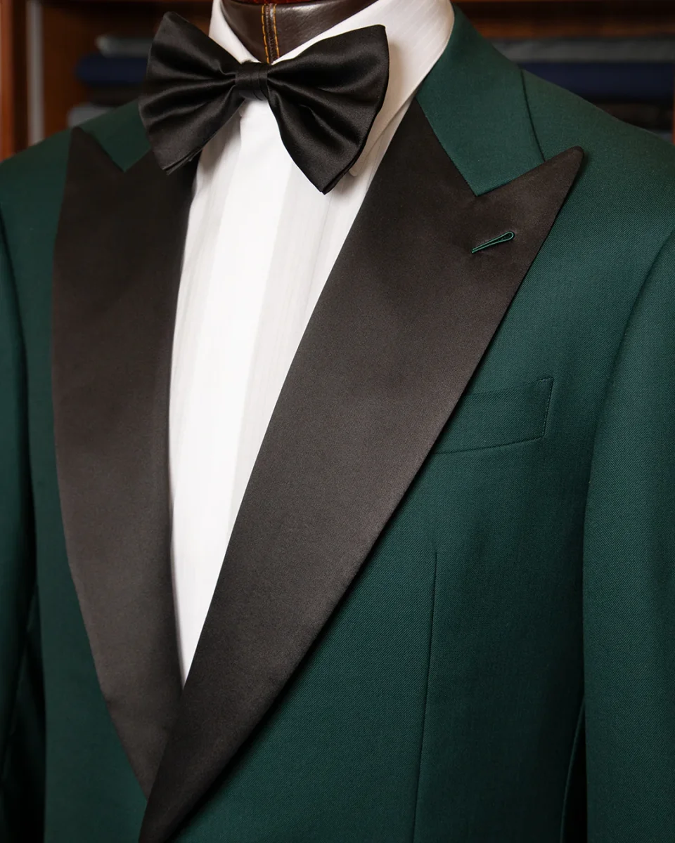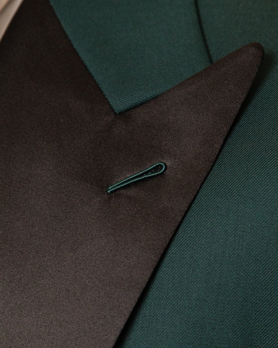 - Giacca verde scuro con rever a lancia in raso nero