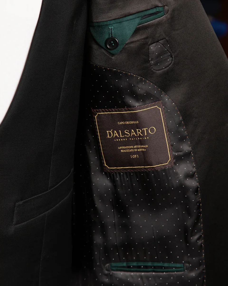 Realizzato in puro tessuto di lana, garantisce comfort, traspirabilità e una vestibilità impeccabile. La giacca verde scuro si distingue per il rever a lancia in raso nero, dettaglio di grande classe che richiama il gilet doppiopetto nero a 4 bottoni con scollo a U, perfettamente coordinato. Le tasche a filetto in raso, la chiusura a un bottone e l’assenza di spacchi posteriori donano una linea pulita e raffinata. Il pantalone nero, senza pinces né passanti, è completato da un elegante tirantino , per un look formale e impeccabile.