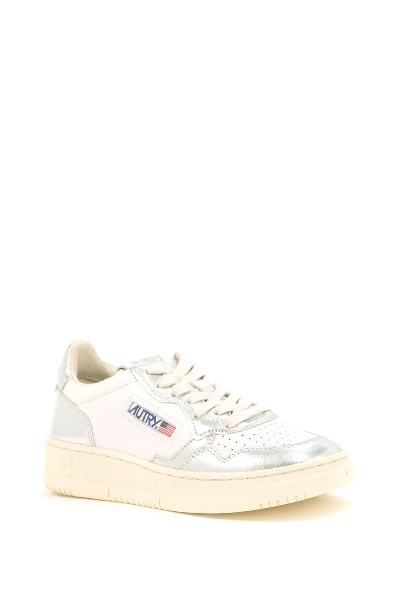 Sneakers basse bianche e argento composizione. Esterno: 100% pelle, fodera: 100% tessuto, suola: 100% gomma