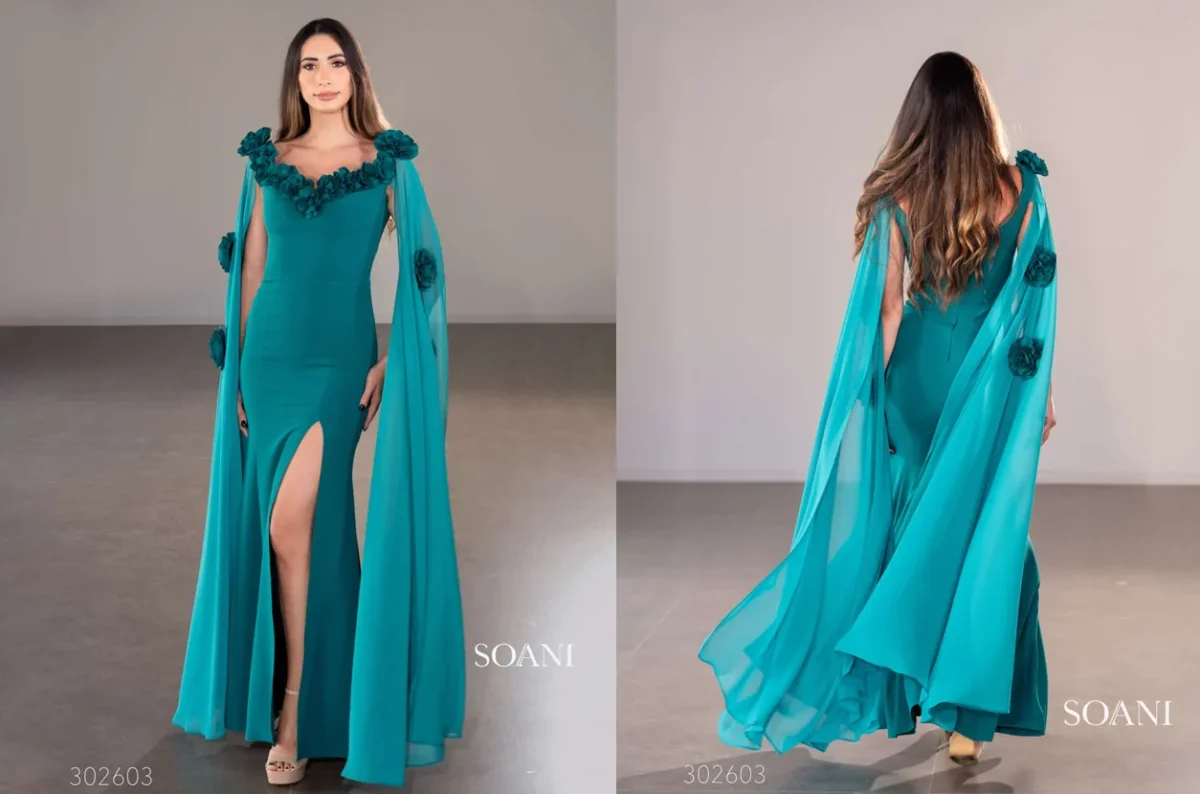Realizzato in un raffinato tessuto verde smeraldo, questo modello si distingue per la sua linea scivolata e per il suggestivo effetto della mantella in chiffon, che cade morbida dalle spalle fino a terra creando un movimento fluido e armonioso.