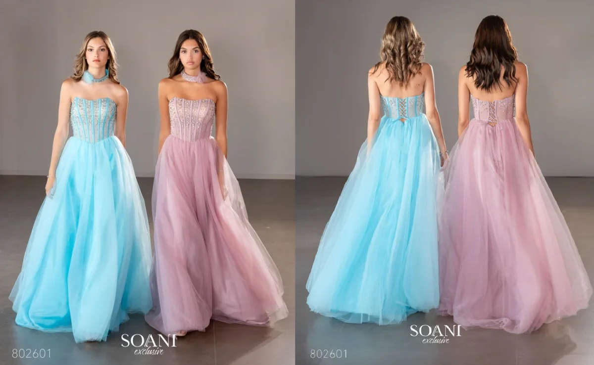 Il sottile scollo a cuore incornicia il décolleté con grazia, mentre la gonna ampia in più strati di tulle crea un effetto etereo e voluminoso, perfetto per sfilare con eleganza.