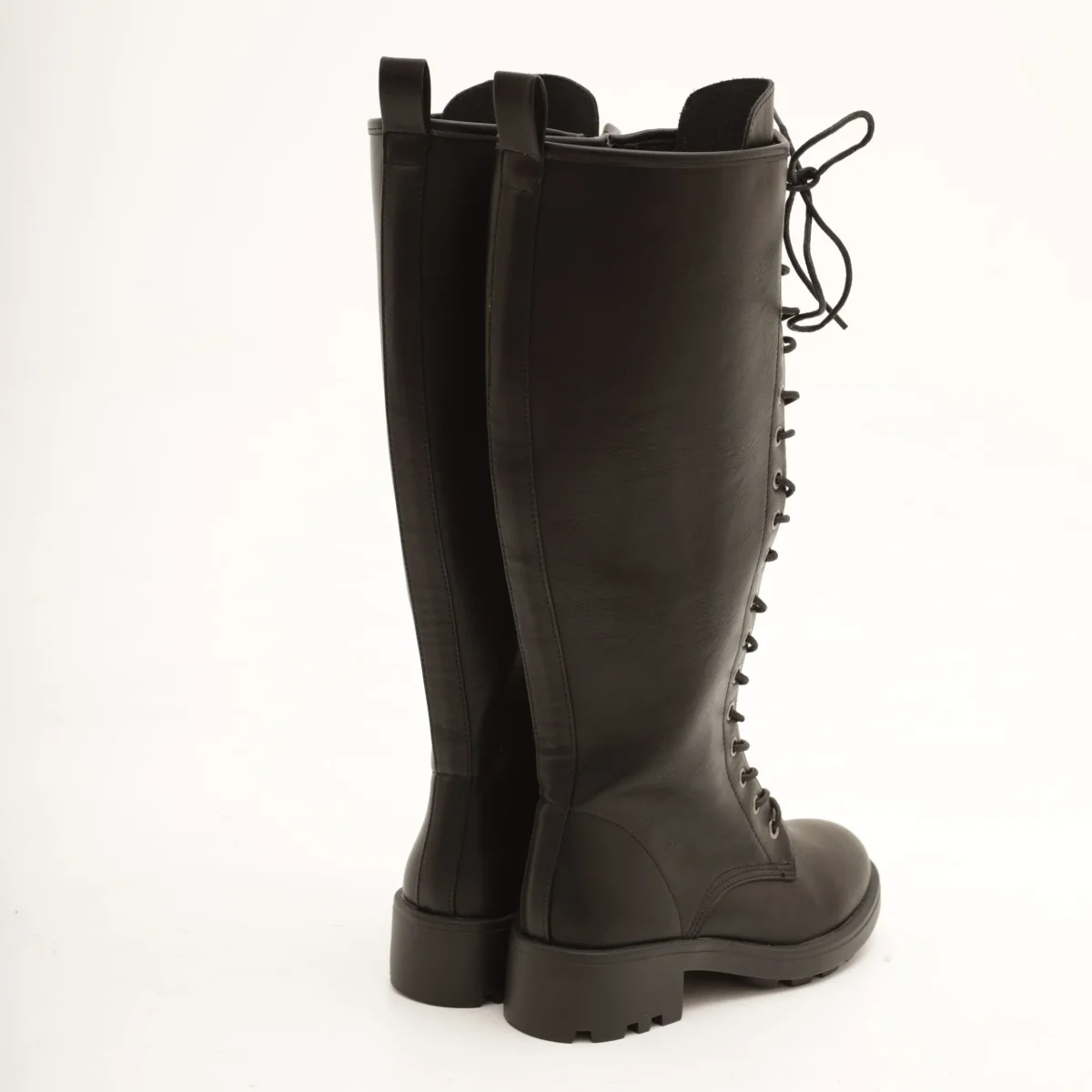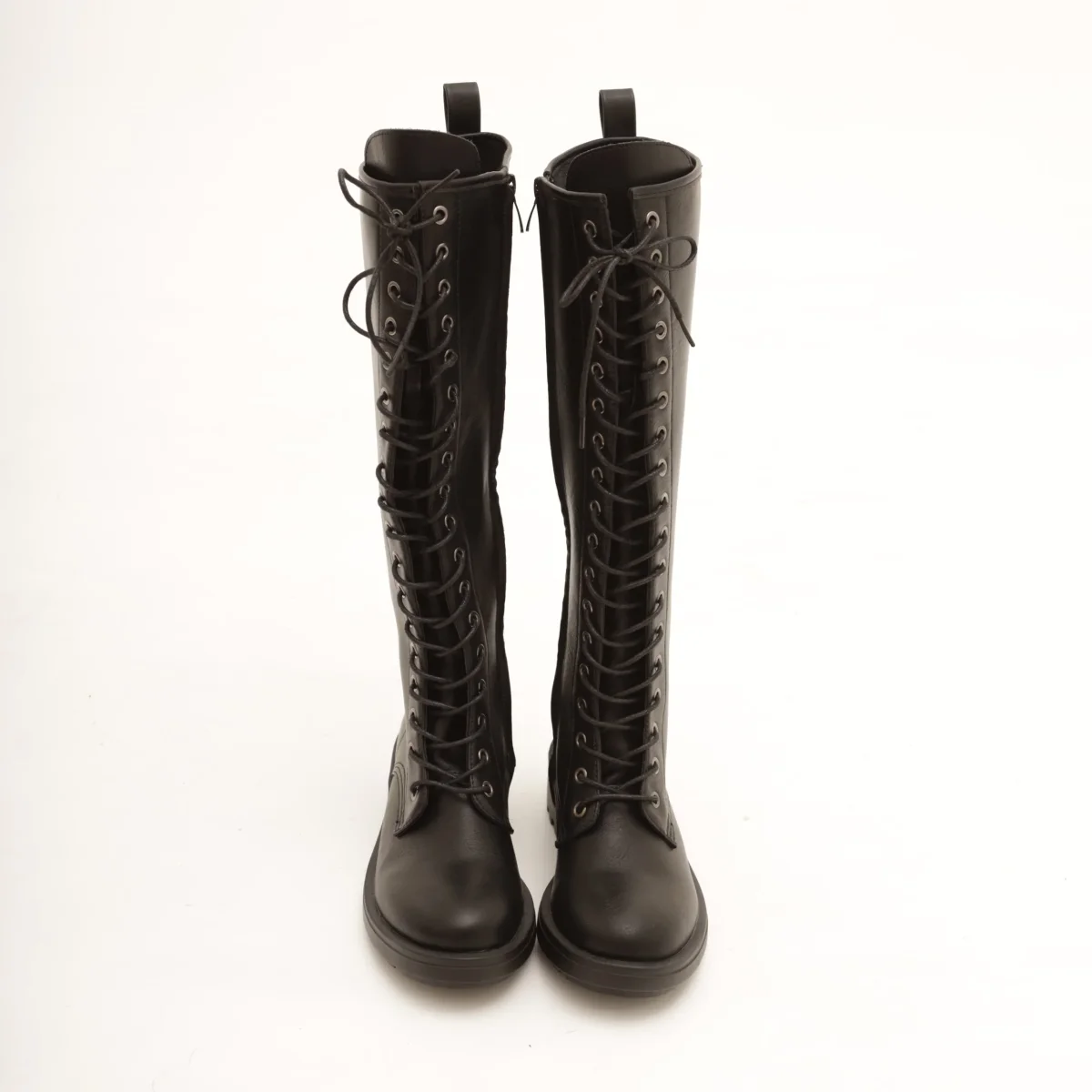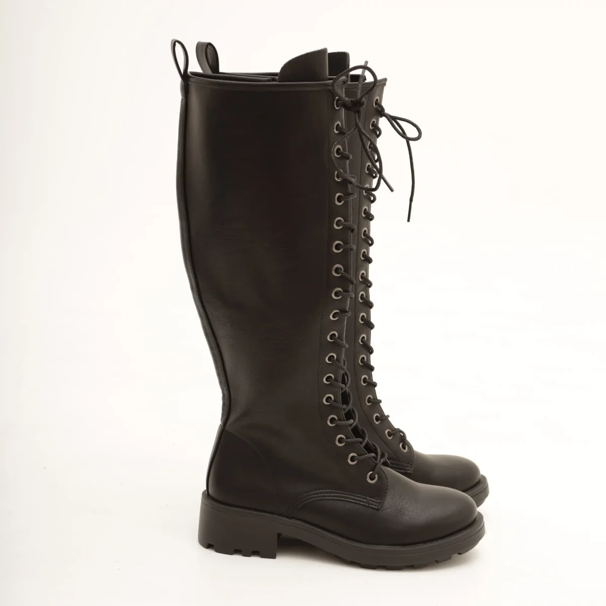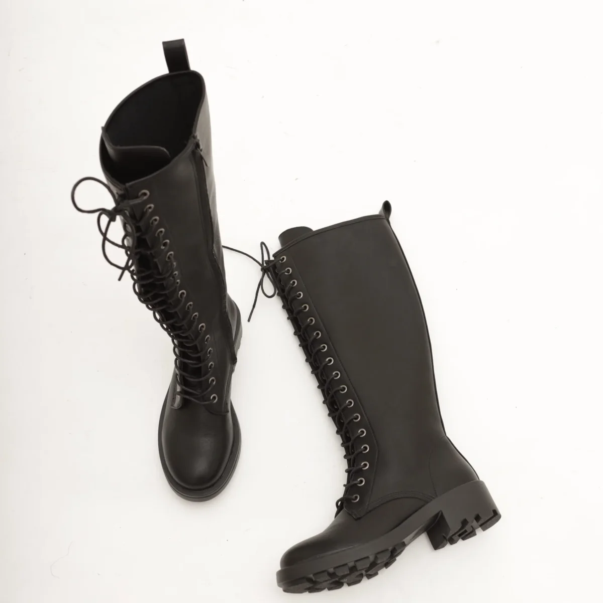 Modello Stivale realizzato in eco-pelle nero. Chiusura con lacci nella parte anteriore e zip laterale interna.