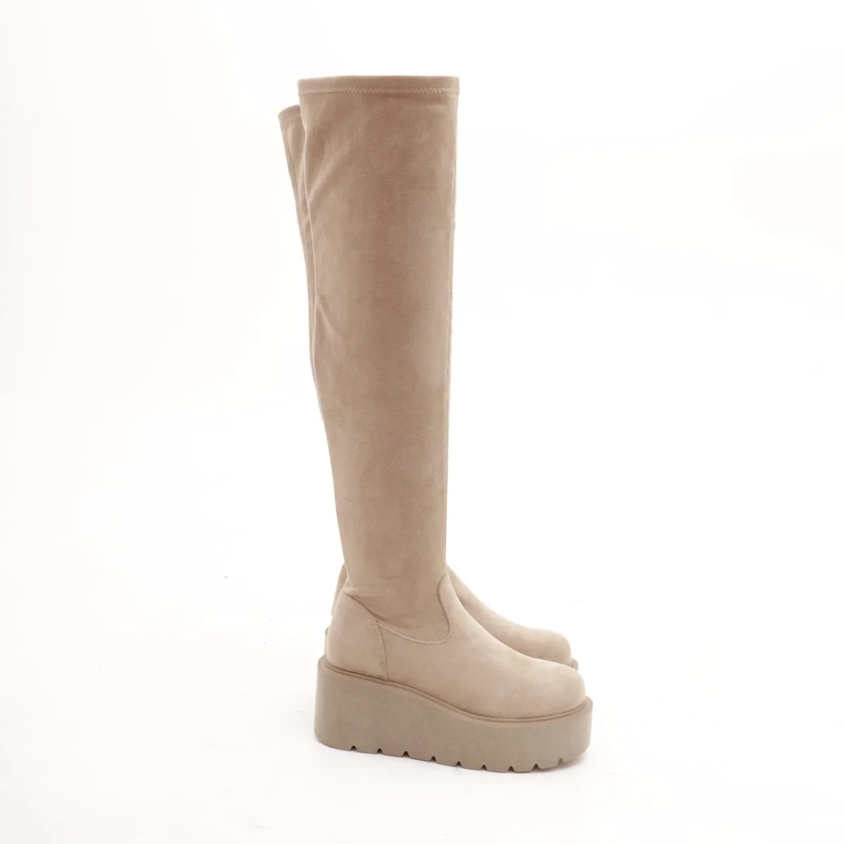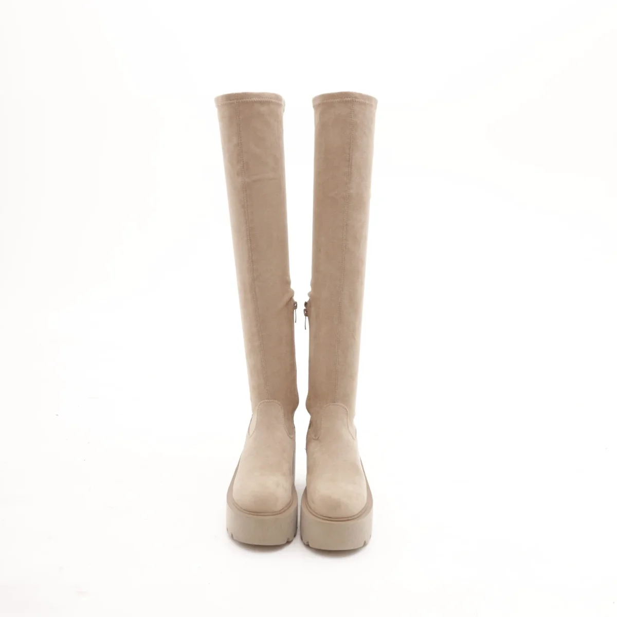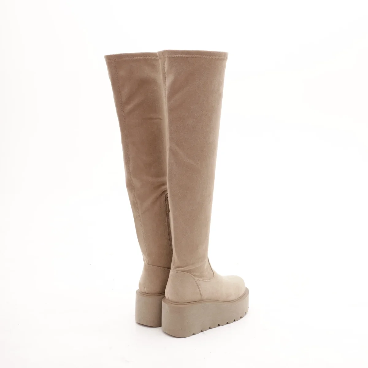Modello Stivale alla coscia realizzato in simil-camoscio Tortora. Chiusura in zip nella parte laterale interna. Disponibile anche nel colore Nero.