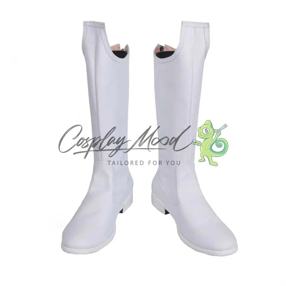 Gli stivali sono lavorati in pelle PU ed impreziositi con dettagli tipici del personaggio in questione. Questo tipo di calzature sono resistenti ad urti e strappi ed appariranno come da immagine: un paio di stivali lunghi bianchi con tre file di bottoncini argentati sul fronte e una striscia nera sul lato dove è posta anche la cerniera.